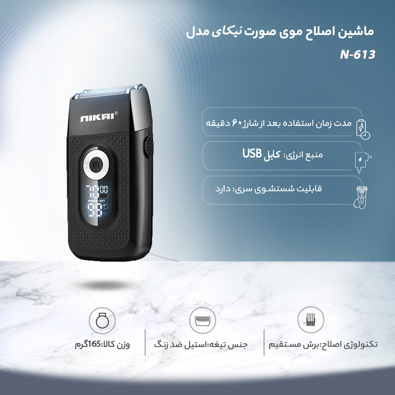 ماشین اصلاح موی سر و صورت نیکای مدل N-613، یک ابزار حرفهای و کارآمد برای افرادی است که به دنبال اصلاحی دقیق و راحت هستند. با طراحی ارگونومیک و ابعاد مناسب ۱۰x۳.۵x۲.۵ سانتیمتر، این دستگاه به راحتی در دست قرار میگیرد و تجربهای لذتبخش از اصلاح را برای شما فراهم میآورد. تیغه استیل ضد زنگ این ماشین اصلاح، با قابلیت اصلاح با شماره صفر و اندازه اصلاح ۰.۱ میلیمتر، امکان برش دقیق و تمیز را به شما میدهد. این دستگاه با قابلیت تنظیم سرعت و امکان استفاده به صورت خشک و مرطوب، به شما این امکان را میدهد که بسته به نیاز خود، اصلاحی متناسب با نوع پوست و موهای خود داشته باشید. همچنین، طراحی ضد آب و سری قابل شستوشو، نگهداری و تمیز کردن دستگاه را آسانتر میکند. با باتری لیتیوم یون و مدت زمان شارژ ۱۲۰ دقیقه، این ماشین اصلاح پس از شارژ کامل، آماده استفاده است و میتوانید به راحتی از آن بهرهبرداری کنید. تجهیزات همراه شامل برس تمیزکننده و محافظ، نگهداری و استفاده از دستگاه را تسهیل میکند. اگر به دنبال یک ماشین اصلاح با کیفیت و قابلیتهای عالی هستید، نیکای مدل N-613 گزینهای مطمئن و مناسب برای شما خواهد بود.