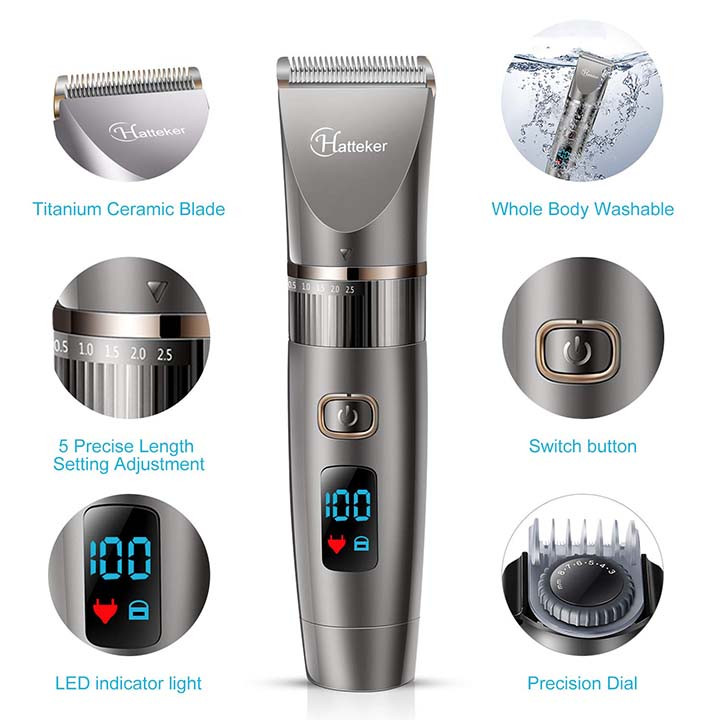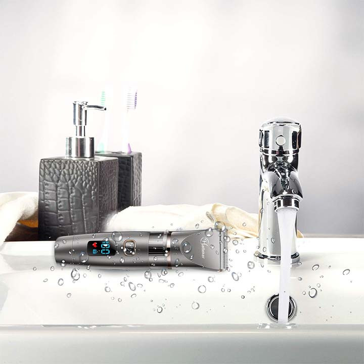 اصلاح کننده مو و ریش بدون سیم hatteker ضد آب می باشد . کاملاً برای همه مدلهای مو و صورت طراحی شده است و می تواند تمامی انتظارات شما از یک ماشین اصلاح را برآورده کند . دارای نمایشگر بزرگی می باشد که میزان شارژ ماشین اصلاح را نشان میدهد و باتری لیتیوم یونی و موتور قدرتمند و بادوامی دارد . به طوری که ظرف مدت 90 دقیقه به صورت کامل شارژ میشود و میتواند 150 دقیقه به صورت مداوم کار کند . می توان آن را مستقیماً توسط آداپتور شارژ کرد و یا آن را به پایه ی مخصوص ماشین اصلاح برای شارژ متصل کرد .