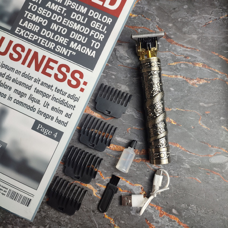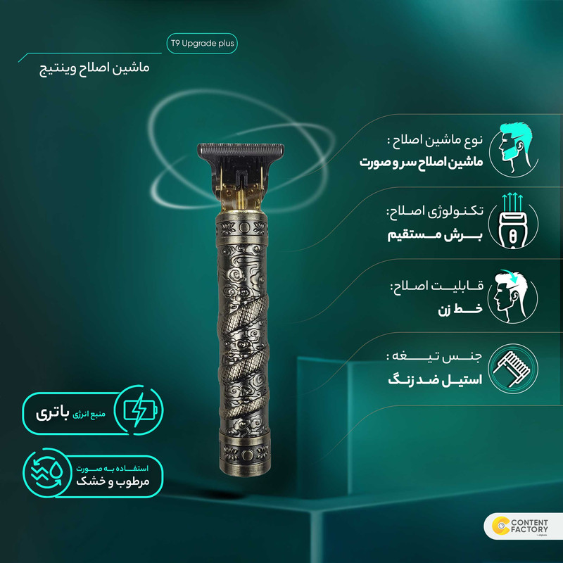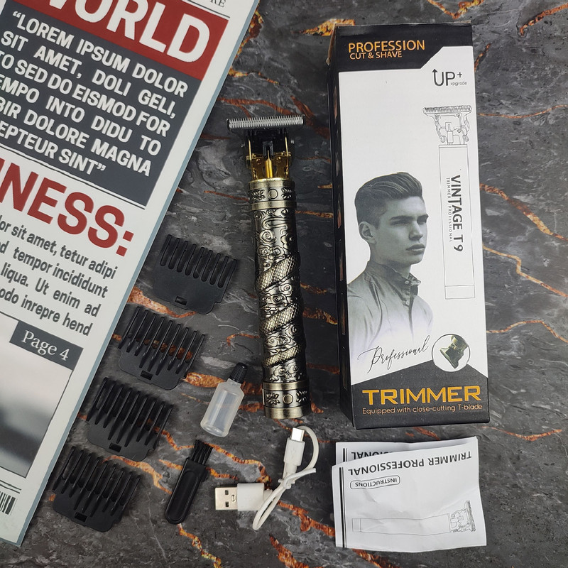 اگر به دنبال یک ماشین اصلاح با کیفیت میگردید که باتری خوبی داشته باشد و همچنان بتوانید به راحتی با خود آن را به سفر ببرید ماشین ریش تراش Vintage مدل T9 Up مناسب شماست. این مدل از کیفیت بالایی برخوردار بوده و برای شما تا 2 ساعت شارژدهی خواهد داشت. مدت زمان شارژ شدن این محصول نیز 2 ساعت می باشد. طرحی این محصول فوقالعاده بوده و طرح اژدها می باشد. تیغه این ماشین از جنس استیل ضدزنگ می باشد. 4 شانه با شماره های 1.5، 2، 3 و 4 در جعبه این محصول قرارگرفته است. همچنین یک فرچه تمیز کننده ، یک روغن و کابل شارژ نیز در جعبه محصول قرارگرفته است.دکمه خاموش/روشن این دستگاه در قسمت زیرین آن قرار دارد و نیروی محرکه آن نیز توسط یک باتری قابل شارژ تامین میشود.
