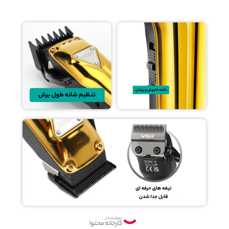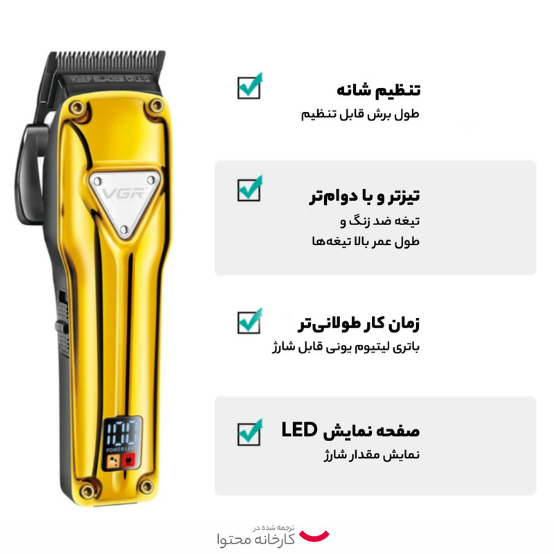| سایر مشخصات | باتری 2500 میلی آمپر، تیغه های حرفه ای جداشونده، اهرم مخروطی چند برش، موتور با عمر طولانی |