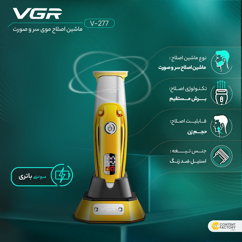 ماشین اصلاح موی سر و صورت وی جی ار مدل V-277 یک دستگاه کامل برای اصلاح موی سر و صورت است. این دستگاه همراه با تجهیزات زیر عرضه میشود: استند شارژ برای نگهداری و شارژ دستگاه، روغن برای استفاده بهتر دستگاه و برس تمیزکننده برای تمیز کردن دستگاه. نوع اصلاح این دستگاه شامل صفر زن و خط زن است. قابلیتهای اصلاح این ماشین شامل قابلیت اصلاح هم سر و هم صورت است. تکنولوژی اصلاح این دستگاه برش مستقیم است که به شما امکان اصلاح دقیق و طبیعی را میدهد. منبع انرژی این دستگاه از طریق کابل USB اتصال به برق یا دستگاههایی مانند لپ تاپ یا شارژر موبایل است. تیغههای این دستگاه از جنس استیل ضد زنگ ساخته شدهاند. وزن این دستگاه تقریباً 790 گرم است. وی جی ار در مدت زمان کوتاهی، تقریباً 150 دقیقه به صورت سریع شارژ شده و پس از شارژ کامل، تا حدود 180 دقیقه قابل استفاده است. اقلام همراه این ماشین اصلاح شامل سیم شارژ USB و 4 عدد شانه به سایزهای 1، 2، 3 و 4 میلیمتر است. با ماشین اصلاح موی سر و صورت وی جی ار مدل V-277 میتوانید به آسانی و با دقت بالا موهای سر و صورت خود را به سبک مورد علاقه خود اصلاح کنید.