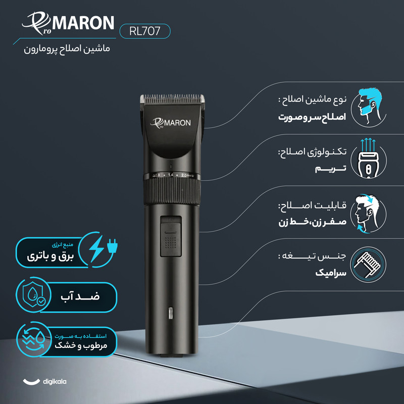 ماشین اصلاح موی سر و صورت پرومارون مدل RL707، یک انتخاب ایدهآل برای افرادی است که به دنبال یک تجربه اصلاح حرفهای و راحت هستند. این دستگاه با موتور قدرتمند ۷۰۰۰ RPM و سه تیغه سرامیکی، اصلاحی سریع و دقیق را برای شما به ارمغان میآورد. طراحی ارگونومیک و مقاوم در برابر لغزش این ماشین اصلاح، استفاده از آن را در هر شرایطی آسان میکند و به شما این امکان را میدهد که حتی در زیر دوش نیز از آن استفاده کنید. با ظرفیت باتری ۲۰۰۰ میلیآمپر ساعت، این دستگاه پس از ۱۲۰ دقیقه شارژ، به مدت ۶۰ دقیقه قابل استفاده است و شما را از نگرانی بابت تمام شدن شارژ بینیاز میکند. نمایشگر دیجیتال این دستگاه اطلاعات دقیقی از وضعیت شارژ و سطح باتری را به شما ارائه میدهد. همچنین، با چهار سری متنوع و شانههای متحرک با اندازههای ۰.۸، ۱.۴ و ۲.۰ میلیمتر، شما میتوانید به راحتی طول موهای خود را تنظیم کنید. از دیگر ویژگیهای این دستگاه میتوان به قابلیت جداسازی تیغه و تمیز کردن آسان آن اشاره کرد. اگر به دنبال یک ماشین اصلاح با کیفیت و کارآمد هستید که تمامی نیازهای شما را برآورده کند، پرومارون مدل RL707 انتخابی مطمئن و مناسب برای شما خواهد بود.