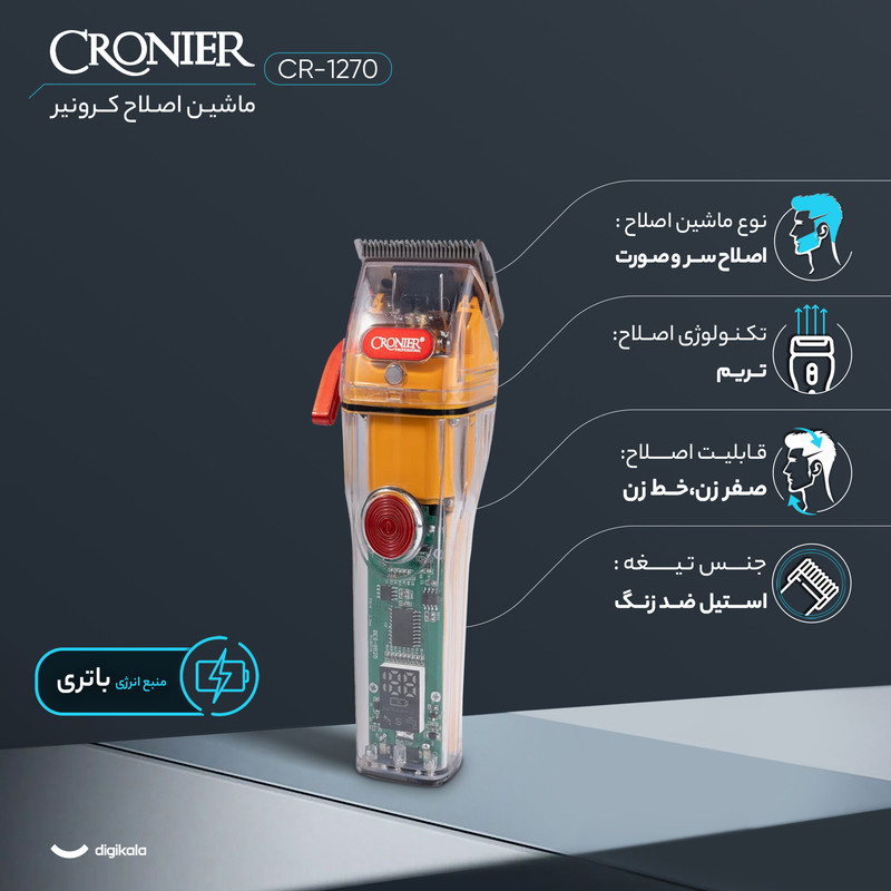 کرونیر مدل CR-1270، ماشین اصلاحی با طراحی منحصر به فرد و خاص است که با توان مصرفی 10 وات و تیغههایی از جنس استیل تیتانیوم ضدزنگ، تجربهای بینظیر در اصلاح مو را ارائه میدهد. دسته تنظیم تیغه این دستگاه امکان تغییر زاویه و عمق برش را فراهم میآورد، در حالی که دور موتور قدرتمند آن که بین 5800 تا 6300 دور در دقیقه قابل تنظیم است، اصلاحی دقیق و سریع را تضمین میکند. دکمه روشن و خاموش به همراه قفل ایمنی که با نگه داشتن دکمه به مدت 3 ثانیه فعال میشود، امنیت و راحتی کاربر را در اولویت قرار میدهد. با قابلیت تنظیم سرعت در دو حالت مختلف، کاربر میتواند بر اساس نیاز خود اصلاح را انجام دهد. باتری قدرتمند 2200 میلی آمپر ساعتی این ماشین اصلاح، 180 دقیقه کارکرد مداوم را بدون نیاز به شارژ مجدد تضمین میکند. صفحه نمایش LCD، درصد شارژ باقیمانده را نشان میدهد که به کاربر اجازه میدهد تا زمان شارژ بعدی را به راحتی مدیریت کند. همراه با این ماشین اصلاح، 8 شانه در سایزهای مختلف، کابل شارژ USB، روغن روان کننده، برس تمیز کننده و درپوش محافظ ارائه میشود که همگی برای ارتقاء تجربه اصلاح و نگهداری آسان دستگاه طراحی شدهاند. با کرونیر مدل CR-1270، هر بار اصلاح، تجربهای لذتبخش و بیدردسر خواهد بود.