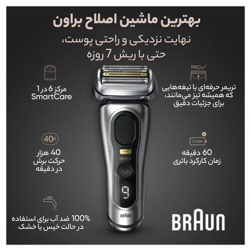 ماشین اصلاح موی صورت شارژی براون مدل +9597cc 9 Pro، یک ابزار حرفهای و کارآمد برای افرادی است که به دنبال اصلاحی دقیق و راحت هستند. با طراحی ارگونومیک و وزن ۴۰۰ گرم، این دستگاه به راحتی در دست قرار میگیرد و تجربهای لذتبخش از اصلاح را برای شما فراهم میآورد. تیغه تیتانیوم پیشرفته این ماشین اصلاح، قابلیت اصلاح با شماره صفر و شیو فویلی را به شما میدهد و امکان برش دقیق تا ۰.۱ میلیمتر را فراهم میکند. این دستگاه به دلیل قابلیت ضد آب، امکان استفاده در زیر دوش را نیز دارد و میتوانید به راحتی آن را تمیز کنید. با ظرفیت باتری ۶۰۰ میلیآمپر ساعت و مدت زمان شارژ ۶۰ دقیقه، این دستگاه به مدت ۶۰ دقیقه قابل استفاده است و امکان شارژ سریع آن، شما را از نگرانی بابت تمام شدن شارژ بینیاز میکند. با چهار شانه قابل تنظیم در اندازههای ۱، ۲ و ۳ میلیمتر، شما میتوانید به راحتی طول موهای خود را تنظیم کنید. با تجهیزات همراه شامل کارتریج و پایه، نگهداری و استفاده از این دستگاه بسیار آسان است. اگر به دنبال یک ماشین اصلاح با کیفیت و قابلیتهای عالی هستید، براون مدل +9597cc 9 Pro انتخابی مطمئن و مناسب برای شما خواهد بود.