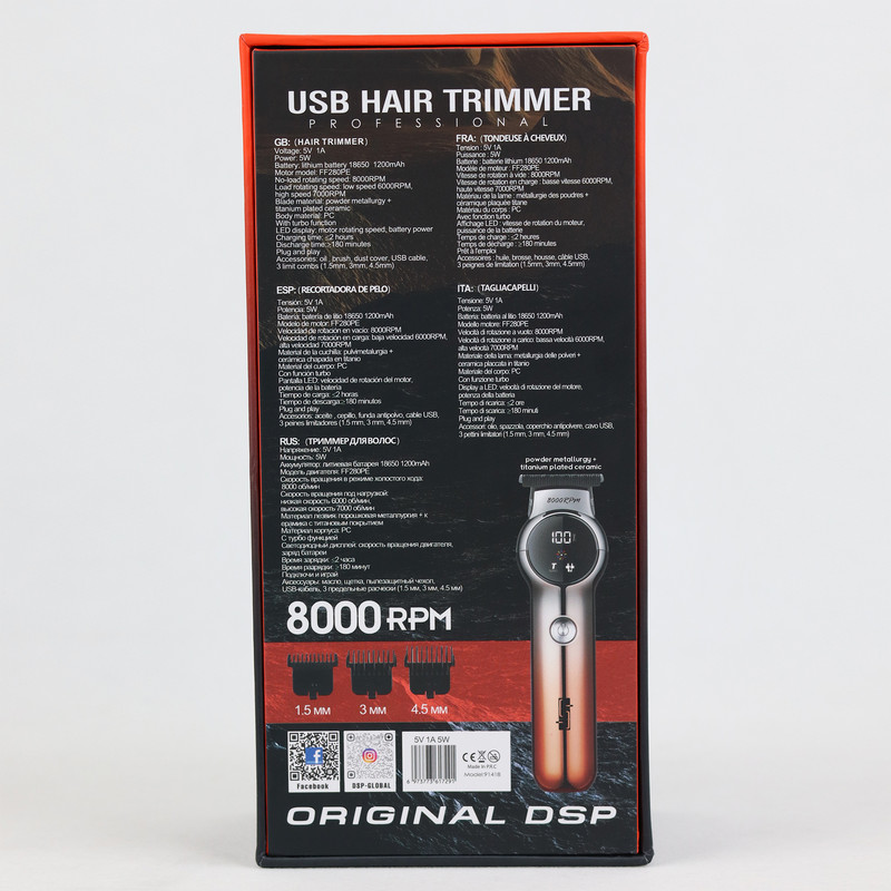 ماشین اصلاح DSP مدل 91418 با طراحی حرفه‌ای و تکنولوژی پیشرفته، ابزاری بی‌نظیر برای اصلاح دقیق و بادوام است. این ماشین اصلاح با سرعت موتور قدرتمند 8000 دور در دقیقه (RPM) به شما امکان اصلاحی سریع و تیز را می‌دهد. موتور 5 وات این دستگاه که با باتری لیتیومی 1200 میلی‌آمپری تغذیه می‌شود، تا 180 دقیقه استفاده مداوم را فراهم می‌کند و برای استفاده شخصی و حرفه‌ای ایده‌آل است. ماشین اصلاح DSP با قابلیت شارژ سریع و طراحی بی‌سیم، راحتی و انعطاف‌پذیری را در هر مکانی به شما ارائه می‌دهد. این دستگاه با سه شانه قابل تنظیم (1.5 میلی‌متر، 3 میلی‌متر و 4.5 میلی‌متر) برای نیازهای مختلف اصلاح مو و تیغه فلزی با دوام و حفظ تیزی برای طولانی‌مدت همراه است. نمایشگر دستگاه به شما سرعت چرخش و میزان شارژ باتری را به صورت لحظه‌ای نشان می‌دهد و به شما کنترل بیشتری در اصلاح می‌بخشد. این دستگاه همراه با لوازم جانبی ضروری از جمله برس، کاور گرد و غبار و کابل USB ارائه می‌شود که به شما در حفظ ظاهری مرتب و شیک کمک می‌کند. ماشین اصلاح DSP با دقت و ظرافت طراحی شده و تنها یک ابزار نیست، بلکه یک ارتقای سبک زندگی است که با هر بار استفاده تجربه‌ای بهتر را برای شما فراهم می‌کند. با DSP تجربه‌ای از تکنولوژی پیشرفته و طراحی زیبا داشته باشید، جایی که حرفه‌ای بودن و کارایی در کنار هم معنا پیدا می‌کنند.