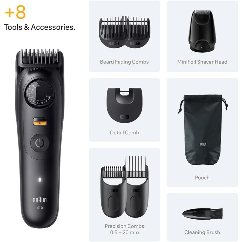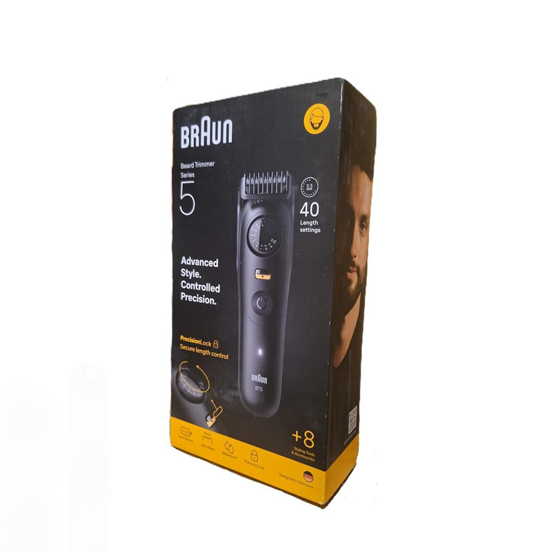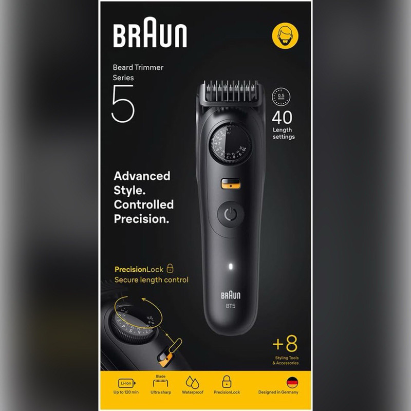 ماشین اصلاح صورت براون مدل BT5560(اروپا) کاملا ضد آب است که امکان اصلاح حتی در حمام را برای شما فراهم می کند و شستشوی دستگاه را بسیار آسان نموده است(easy clean).دارای قابلیت prowheel که با استفاده از آن می توانید شماره اصلاح خود را با حساسیت نیم میلی متری (40 شماره) از 0 تا 20 میلی متر تنظیم نمایید.دارای باطری Li-Ion که با یک مرتبه شارژ کامل می توانید 120 دقیقه از آن استفاده کنید(زمان مورد نیاز برای شارژ کامل 1 ساعت).اصلاح موهای ضخیم همیشه سخت بوده اما با استفاده از تیغه های فولادی ضد زنگ در این مدل و فناوری ultra sharp blade به راحتی موهای ضخیم را اصلاح کنید.یک نشانگر LED برای نمایش وضعیت شارژ و اتمام باطری روی دستگاه قرار دارد. برای جلوگیری از تغییر شماره هنگام اصلاح،کلید pro lock روی بدنه دستگاه قرار گرفته است.اقلام همراه دستگاه شامل یک عدد شانه اصلاح برای 0.5 تا 10 میلی متر،یک عدد شانه اصلاح برای 10.5 تا 20 میلی متر،یک عدد سری فویلی mini foil shaver head برای اصلاح مناطق حساس،یک عدد سری detail comb برای اصلاح دقیق و جزییات،دو عدد شانه برای سایه ریش صورت از 1 تا 5 و برعکس، برس تمیز کننده،کیف نگه دارنده و شارژر می باشد.