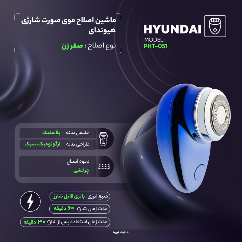 ماشین اصلاح موی صورت شارژی هیوندای مدل PHT-051 با طراحی ارگونومیک و ابعاد کوچک 5×8 سانتیمتر، گزینهای فوقالعاده برای استفاده روزمره، سفر و مهمانیها است. منبع انرژی باتری قابل شارژ و فناوری اصلاح چرخشیِ صفر زن، این محصول را هم برای اصلاح خشک و هم مرطوب مناسب کرده و بهراحتی در دوچرخه سفر یا کیف لباستان جای میگیرد. تیغههای استیل ضدزنگِ جداشونده، دوام و کارایی بالایی ارائه میدهند و امکان نظافت آسان را فراهم میکنند. با وزن تنها 60 گرم و طراحی سبک، استفاده طولانی مدت خستهکننده نیست و بهخاطر داشتن نمایشگر وضعیت باتری، همیشه از شارژ باقیمانده مطلع میشوید تا بدون وقفه به استایل مطلوب برسید. زمان شارژ 60 دقیقه است و پس از شارژ کامل، تا حدود 50 دقیقه امکان استفاده وجود دارد که برای چندین بار اصلاح در هفته کافی است؛ در حالت استفادهای کوتاهتر هم، پس از هر بار شارژ، با 30 دقیقه استفاده مفید روبهرو میشوید. کابل شارژ تایپ سی و برس تمیزکننده همراه، روند نگهداری و شارژ را ساده و کارآمد میکند. این دستگاه با قابلیت استفاده به صورت خشک و مرطوب، ضد آب بودن و قابلیت اصلاح با دقت بالا، بهخوبی برای مکاپ و آرایش روزانه مناسب است. همچنین، با قابلیت اصلاح صفر زن و تیغههای قدرتمند، میتوانید خط ریش و اطراف لب را با دقت فوقالعاده حالت بدهید. برای کسانی که به دنبال یک دستگاه همهجانبه، جمعوجور و با عملکرد پایدار هستند، مدل PHT-051 انتخابی مطمئن و کارآمد است.