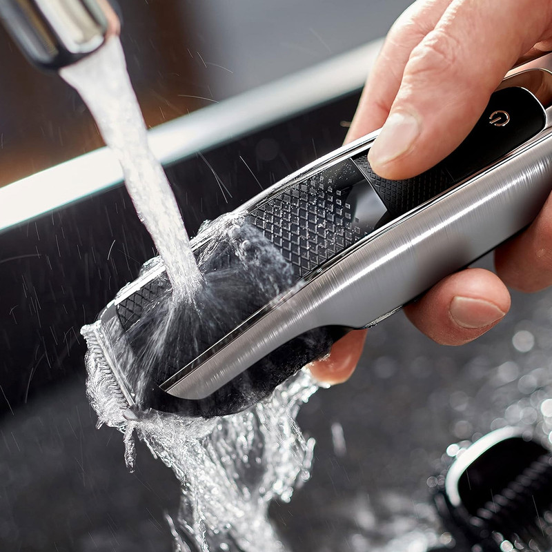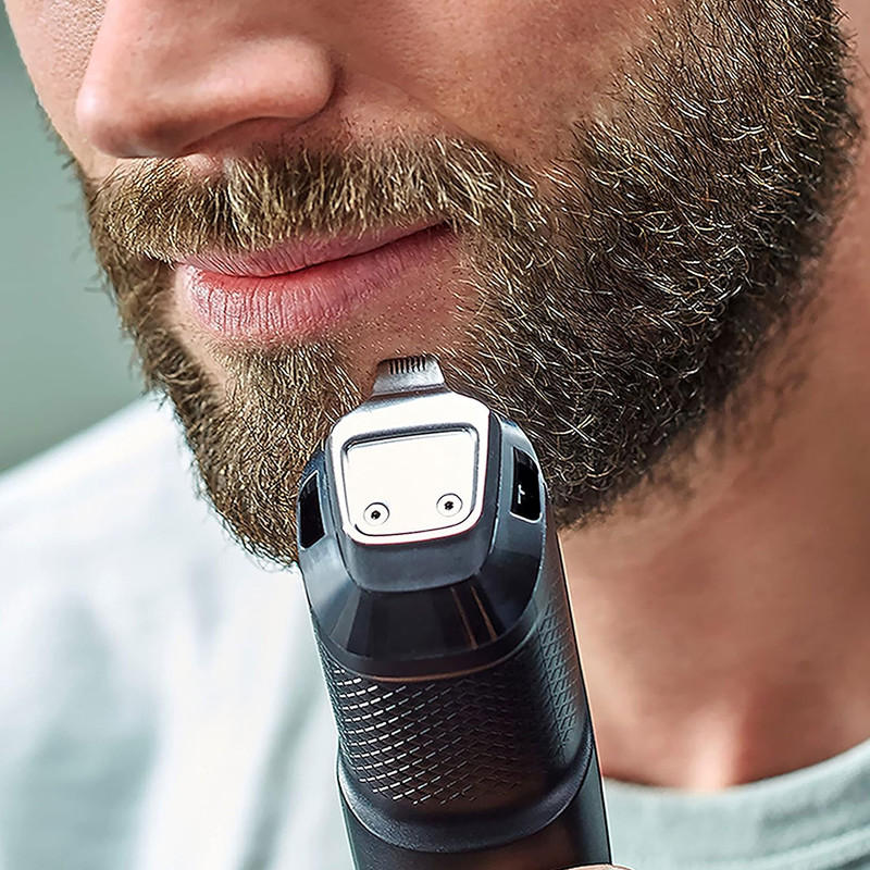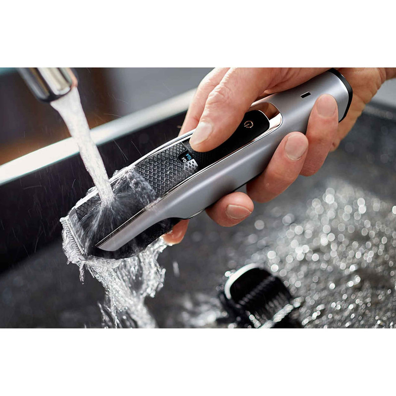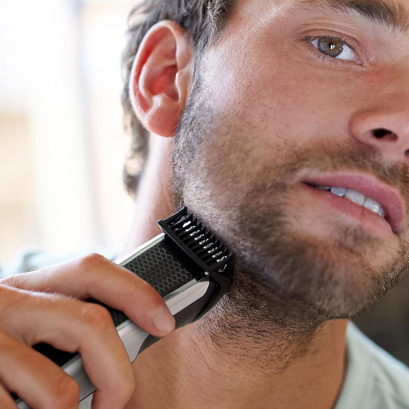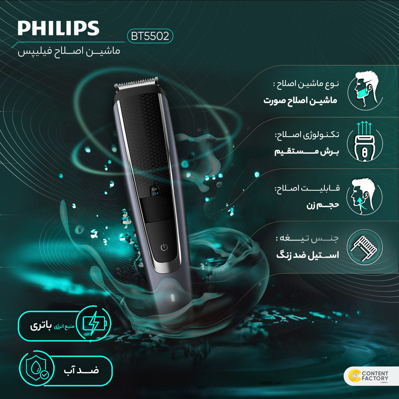 ماشین اصلاح یک دستگاه بسیار کاربردی برای آقایان است که میتوانند علاوه بر ریش، موهای پشت گردن و خط ریش خود را نیز مرتب کنند. ماشین اصلاح صورت فیلیپس مدل BT5502 دستگاهی برای اصلاح موهای صورت مجهز به باتری لیتیومی است. این ماشین اصلاح، قابلشارژ است. این مدل از ماشین اصلاح صورت فیلیپس یک محصول بی نظیر برای آقایان است که استفاده از آن محدودیتی ندارد. شما با استفاده از این دستگاه میتوانید ریش، موهای پشت گردن و حتی موهای بدن خود را نیز بتراشید. ریشتراش «فیلیپس» (Philips) با طراحی ویژه تیغهها و ظاهر زیبا، محصولی منحصر به فرد به شمار میآید. با استفاده از دو شانه این ماشین و تنظیمات ارتفاع که توسط کلید ولومی روی دستگاه – تا 40 تنظیم – قابل انتخاب است، اصلاح خود را دقیق تر کنید. این تنظیمات برای شانه کوچک از 0.4 تا 10 میلی متر و برای شانه بزرگ از 10 تا 20 میلی متر است. ویژگی جالب ماشین اصلاح صورت فیلیپس در دقت این تنظیمات ارتفاع است. به طوری که بین 0.4 تا 2 میلی متر ارتفاع دقت 0.2 میلی متری، بین 2 تا 5 میلی متر ارتفاع دقت 0.5 میلی متری و از 5 میلی متر به بالا دارای دقت 1 میلی متری است. این ویژگی به خودی خود باعث می شود دست شما برای هر شکل و اندازه ای از اصلاح باز باشد و قدرت مانور بالایی داشته باشید. بعد از 1 ساعت شارژ کامل میتوانید تا 90 دقیقه از این دستگاه استفاده کنید. این ماشین اصلاح دارای ویژگی شارژ سریع است که بعد از 5 دقیقه شارژ میتوانید از آن برای یک اصلاح کامل استفاده کنید. همچنین می توانید هنگامی که ماشین اصلاح در برق است از آن استفاده کنید. ماشین اصلاح BT5502 فیلیپس کاملا ضدآب برای تمیزسازی است و میتوانید آن را مستقیما زیر اب بگیرید و تمیز کنید.