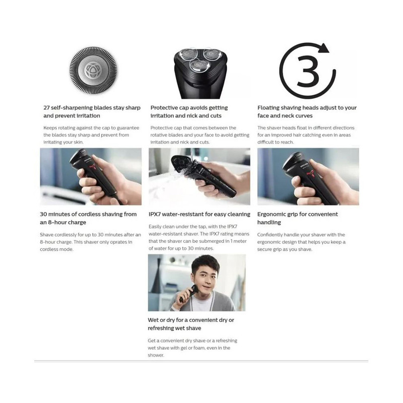 سری حساس این ماشین اصلاح دارای 3 عدد تیغه چرخشی است که در جهت های مختلف قابلیت چرخش دارند و به شکل جداگانه حرکت میکنند و به اصطلاح شناور هستند و این بدین معنی است که تیغهها نسبت به صورت تغییر موقعیت میدهند و با شکل صورت هماهنگ میشوند، که این ویژگی، اصلاح نقاطی مانند چانه و زیر گردن را بسیار راحت تر میکند و کیفیت اصلاح را بالا تر برده و موجب صافی و نرم تر شدن پوست صورت میشود. این مدل موتوری با قدرت مناسب دارد. این دستگاه با باطری قابل شارژ کار میکند که به 8 ساعت زمان شارژ نیاز دارد و زمان کارکرد آن 30 دقیقه میباشد. این مدل طراحی آرگونومیک بسیار خوش دست و وزن سبکی دارد. ظاهر مینیمال این مدل بسیار چشم نواز و زیبا میباشد و مشابه محصولات دیجیتال سری GAME فیلیپس طراحی شده است. این دستگاه با وجود موتوری قدرتمند صدای کمی دارد و موتور دستگاه به محافظت کننده دمایی مجهز شده است تا خیال کاربران در زمان استفاده کاملا آسوده باشد. چنانچه قصد خرید ماشین اصلاح از برندهای معتبر ولی با قیمتی مناسب را دارید این مدل انتخاب مناسبی میباشد.