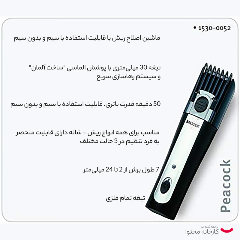ماشین اصلاح موی صورت موزر مدل 0052-1530، اصلاح به صورت تریمر، طراحی ارگونومیک، تیغه سرامیکی، منبع انرژی با باتری قابل شارژ، تکنولوژی اصلاح به صورت تریم، بههمراه استند شارژ، کیف نگهداری