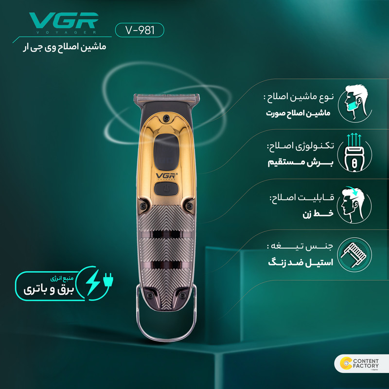 ماشین اصلاح موی صورت وی جی آر مدل V-981، یک ابزار باکیفیت و کاربردی برای اصلاح موی صورت شماست. با استفاده از نمایشگر LED شما همیشه می توانید میزان شارژ باقی مانده را ببینید. همچنین، این ماشین اصلاح دارای قابلیت توربو است که به شما امکان می دهد تا با سرعت بیشتری اصلاح کنید. با 2 ساعت شارژ کامل، دستگاه تا 2 ساعت کار مداوم را تضمین می کند.این محصول با 3 عدد شانه با سایز های 1 ، 2 و 3 میلیمتری، برس تمیزکننده، روغن رون کننده و کابل شارژر عرضه می شود. همچنین، یک حلقه آویز نیز برای راحتی شما در نگهداری و استفاده از ماشین اصلاح مو در نظر گرفته شده است. به طور کلی می توانید از این دستگاه برای خط زنی، صفر زنی و اصلاح سر و صورت استفاده نمایید.