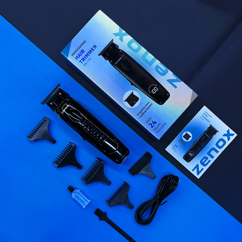 ماشین اصلاح موی صورت و بدن زیناکس مدل 124 از برترین تریمیر های کمپانی ZENOX میباشد . کمپانی زیناکس یه شرکت آمریکایی هست که کالا های خود را به بالاترین کیفیت بهمراه گارانتی معتبر وارد بازار میکند. مزیت دستگاه زیناکس 124 تیغه هایی از جنس آلیاژ استیل ضد زنگ و گرافیت ( مدل DLC 2.0) دارد که گرافیت موجود در این تیغه ها باعث میشود به مرور زمان قابلیت خود تیزشوندگی پیدا کند . این دستگاه دارای یه موتور با گشتاور 7500RPM میباشد و با یه باتری 2800 میلی آمپری توان خروجی 8واتی را به شما میدهد. با هربار شارژ 3 ساعته ،از دستگاه میتوان 260 دقیقه مداوم استفاده کرد که اگر برای مصرف خانگی بخواهید استفاده کنید نیاز 2ماه اصلاح شمارا برطرف میکند. کابل شارژ دستگاه به صورت USB TIPE C تعبیه شده است تا در هر مکانی با شارژر USB TIPE C بتوانید دستگاه را شارژ کنید . زیناکس 124 همچنین از نمایشگر شارژ و باتری و روغن برخوردار است تا هم زمان باقی مانده شارژ را به شما نمایش دهد و هم به شما یادآور روغن کاری دستگاه باشد که برای دوام بیشتر کالا بهتر از هربار استفاده تیغه هارا تمیز و روغن کاری کنید . اندازه زیناکس 124 به راحتی در کف دست جا می شود. ماشین اصلاح 124 دارای تیغهی T شکل است که به کمک این تیغه میتوان موهای سر را در اندازههای 0.1 میلیمتر کوتاه کرد و باتوجه به طرحی حرفه ای بدنه که دور تیغه آزاد گذاشته شده است ، مناسب ظریف کاری و صفرزنی و خط ریش می باشد .برای اصلاح مو در اندازههای مختلف 3 عدد شانهی اصلاح با طول برش 1-2-3-4 میلیمتر ارائه شده که روی تیغه قفل میشوند.ماشین اصلاح 124 داخل یک جعبه پلاستیکی محکم ارائه شده و داخل جعبه، برس تمیزکننده و روغن نیز قرار دارد. از ماشین اصلاح زیناکس 124 برای خط زنی حرفه ای و ایجاد طراحی های ظریف و جزئیات مانند تتو های مو استفاده می شود.