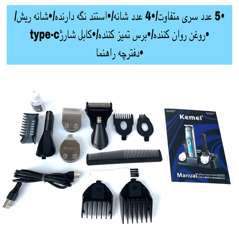 | سایر مشخصات | دارای 5 عدد سری متفاوت جهت اصلاح موی صورت/بدن/بینی و گوش-دارای 4 عدد شانه-استند نگه دارنده-چراغ نشانگر شارژ- |
