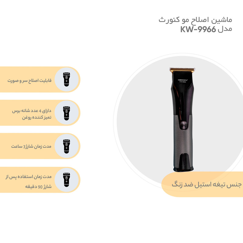داشتن یک ماشین اصلاح عالی یعنی پیشرفت کار در سالن و صرفهجویی در زمان در استفاده شخصی. با انتخاب یک ماشین اصلاح عالی میتوانید سرعت کار خود را چند برابر کنید. ماشین اصلاح کنورث (Kenworth) مدل KW-9966 یک محصول فوق العاده عالی برای کارهایی همچون اصلاح ریش، اصلاح موهای دور گردن و خط ریش یا اصلاح موی سر است و همچنین قابلیت اصلاح بدن را نیز دارد. با داشتن یک ماشین اصلاح کارآمد میتوانید سرعت و کیفیت کار خود چه برای استفادههای شخصی و چه برای استفاده در سالنها بالا ببرید. ماشین اصلاح کنورث مدل KW-9966 دارای تکنولوژی اصلاح بصورت برش مستقیم است. این ماشین اصلاح دارای بدنه مقاوم است. همچنین با طراحی استاندارد و ارگونومیک و بسیار خوش دست به بازار عرضه شده است. تیغههای این ماشین اصلاح از جنس استیل ضد زنگ است که کیفیت و طول عمر بالایی دارد و برای مدت طولانی کارایی خود را حفظ میکند. در بسته بندی این محصول 4 عدد شانه اصلاح در سایزهای 1، 2، 3و 4 میلیمتر و همچنین برس تمیزکننده و روغن به همراه این ماشین ارائه میشود. منبع تغذیه این محصول باتری قابل شارژ است. این باتری برای شارژ کامل 3 ساعت زمان نیاز دارد که پس از آن به مدت 90 دقیقه به صورت پیوسته میتوان از آن استفاده کرد. برای اطلاع از میزان شارژ یک نشانگر شارژ نیز روی دستگاه تعبیه شده است.