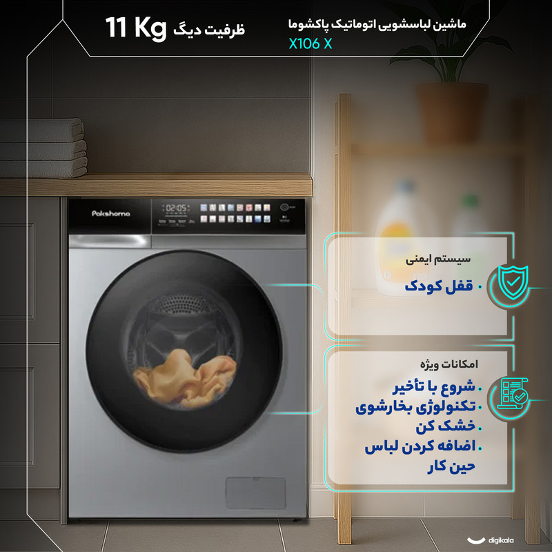 در بخش طراحی، ماشین لباسشویی 11 کیلوگرم اتوماتیک پاکشوما مدل X106 X با بدنه آلومینیومی مقاوم، درب از جلو با باز شدن به سمت چپ و طراحی دیگ استیل ضدزنگ الماسه ساخته شده است. این ساختار از آسیب دیدن الیاف جلوگیری میکند و کیفیت شستوشو را افزایش میدهد. کنترل ترکیبی لمسی و چرخشی استفاده از دستگاه را سادهتر میکند و ابعاد ۸۵ × ۶۰ × ۶۴ سانتیمتری، امکان نصب آسان دستگاه را در فضاهای استاندارد فراهم میسازد. این مدل با ظرفیت بالا، موتور قدرتمند و امکانات حرفهای، انتخابی مناسب برای خانوادههایی است که به شستوشوی حجم زیاد و عملکرد مطمئن نیاز دارند.