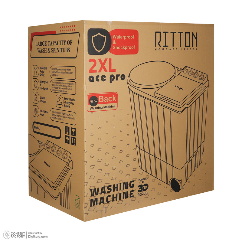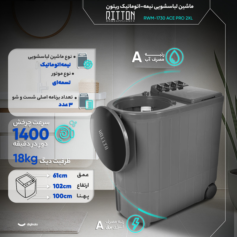 ماشین لباسشویی ۱۸ کیلوگرم نیمهاتوماتیک ریتون مدل RWM‑1730 ACE PRO 2XL با ظرفیت بسیار بالا و طراحی کارآمد، یکی از بهترین گزینهها برای خانوادههای پرجمعیت یا محیطهایی مانند خوابگاهها و مراکز اقامتی است که نیاز به شستوشوی مداوم و حجیم دارند. این دستگاه با طراحی درب از بالا و بدنه پلاستیکی مقاوم، در برابر رطوبت و ضربه استحکام خوبی دارد و ابعاد ۱۰۲ سانتیمتر ارتفاع، ۱۰۰ سانتیمتر پهنا و ۶۱ سانتیمتر عمق امکان قرارگیری آسان آن را فراهم میکند. دهانه در ۴۴ سانتیمتری و بازشدن ۹۰ درجهای به سمت بالا نیز انجام فرآیند بارگذاری لباس را بسیار سادهتر میسازد.