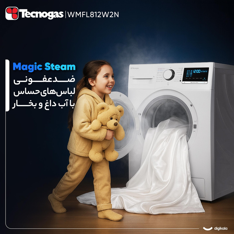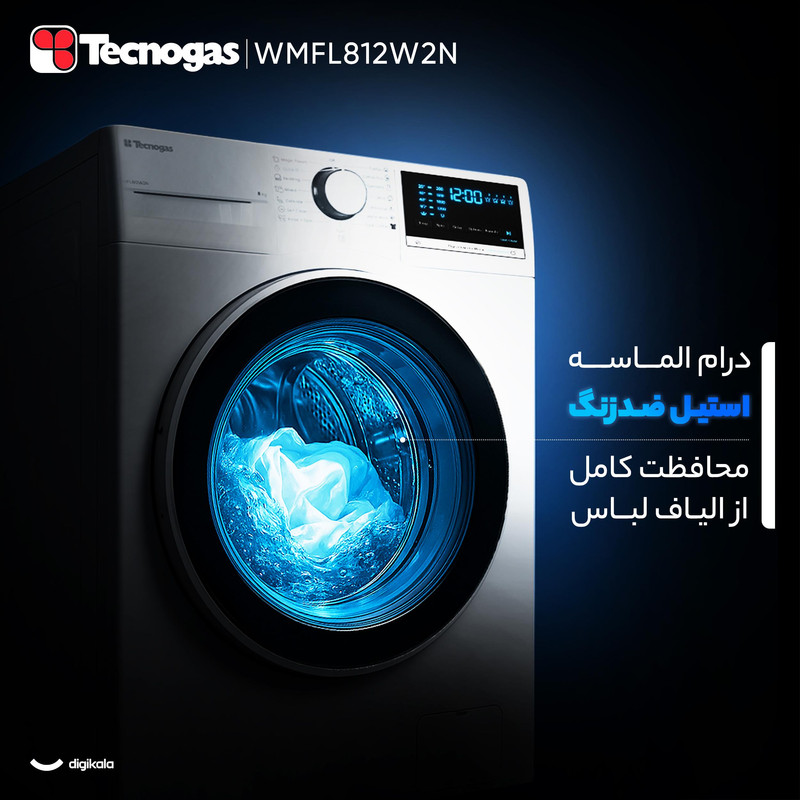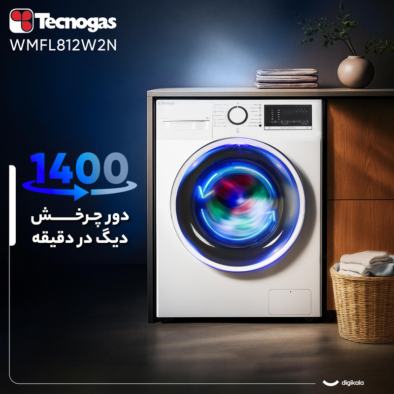ماشین لباسشویی اتوماتیک تکنوگاز مدل WMFL812W2N با ظرفیت ۸ کیلوگرم برای خانوادههایی طراحی شده است که دوام، مصرف بهینه و عملکرد دقیق را در قالب دستگاهی مدرن میخواهند. موتور اینورتر با سرعت چرخش ۱۲۰۰ دور در دقیقه شستوشویی پرقدرت و در عین حال کمصدا را فراهم میکند. میزان نویز ۷۰ دسیبل در محدودهای مناسب قرار دارد و رده انرژی B همراه با مصرف آب A کارایی اقتصادی دستگاه را نشان میدهد. میزان مصرف آب در هر چرخه ۴۸ لیتر و مصرف برق ۱.۱ کیلوواتساعت است که بازده مصرفی مطلوبی را تضمین میکند.