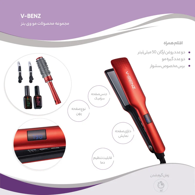 اتو موی وی بنز مدل V-8048 یک محصول فوق العاده عالی و حرفه ایی برای حالت دادن و صاف کردن موهای بلند، کوتاه و رنگ شده. این اتو مو با داشتن صفحات سرامیکی با روکش کراتین فشار روی مو را در حالت یکسان نگه میدارد و از اسیب دیدن و سوختن مو در برابر حرارت زیاد جلوگیری میکند. این محصول رنگ موی شما را در حرارتهای بالا حفظ میکند و از فولیکول و رنگدانههای مو حفاظت میکند. با داشتن کابل چرخشی 360 درجه کار کردن با این مدل را راحت میکند. اتو موی وی بنز مدل V-8048 اقلام همراه فوق العاده ای از قبیل دو عدد گیره مو از همین برند و برس استوانه ایی مخصوص اتو و سشوار مو و همینطور دو عدد بطری روغن فوق العاده و بی نظیر ارگان را دارد که استفاده از این روغنها خود به مرور مو خوره و آسیب دیدگیهای قبلی موها را بر طرف کرده و ضخامت و حجم موهای شما را افزایش میدهد. نحوی استفاده از این روغن مو اینگونه است که قبل از اتو کردن موها با اتوی وی بنز چند قطره از ان را روی موهای نم دار خود ماساژ دهید.