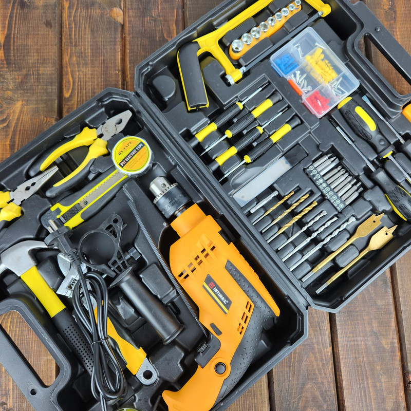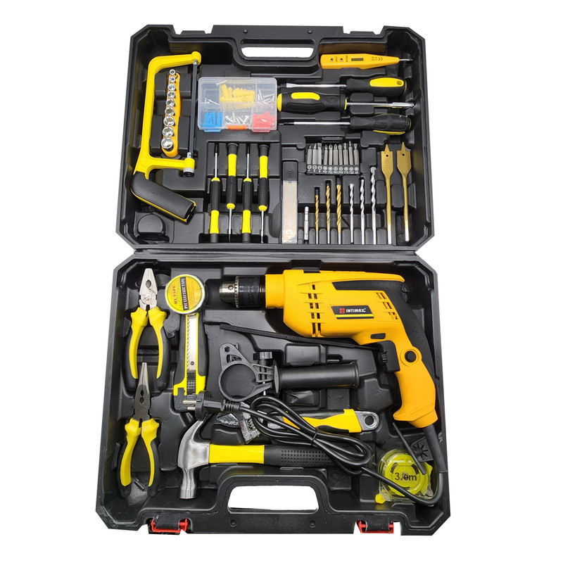 کیت دریل چکشی اینتیمکس یکی از مجموعه هایی می باشد که بیشتر نیاز های کاربران خود را برآورده کرده است این مجموعه ابزار برای کاربری های نیمه صنعتی، تجاری، خانگی بسیار مناسب است . دریل چکشی قرار داده شده در این مجموعه دارای موتور قدرتمند 1200 واتی قرار داده شده و در این دریل سرعت چرخش آزاد 3000-0 دور در دقیقه را به چرخش در می آورد ، همچنین قطر سه نظام این دریل 1.5 الی 13 میلی‌متر می باشد. که از ویژگی های منحصر آن می توان به كنترل سرعت (دیمر) گردش با ميزان فشار به شستي، حداکثر توان سوراخ کاری در فلز 13 میلی متر و در مصالح 13 میلی متر و در چوب 30 میلی متر ، دسته کمکی با قابلیت چرخش 360 درجه اشاره کرد . این مجموعه شامل کلیه ابزارهای مصرفی شامل؛ آچار فرانسه ، انبردست، دمباریک، چکش، بکس تک سایز 4 تا 13، متر 3 متری، پیچ گوشتی دوسو و چهارسو سایز بزرگ، پیچ گوشتی نوک خور،، مته آهن سایز 4 و 5 و 6، مته دیوار سایز 5 ،6 و 4، مته برگی سایز 16و 20، 9 عدد نوک پیچ گوشتی،تبدیل نوک پیچ گوشتی به بکس چسب برق، کاتر، فازمتر دیجیتال، آچار سه نظام،5 عدد تیغ کاتر، دو سایز پیچ گوشتی موبایلی دو سو و دو سایز پیچ گوشتی موبایلی چهارسو،کمان اره چوب و فلز، مجموعه سایزبندی پیچ و رولپلاک می باشد .