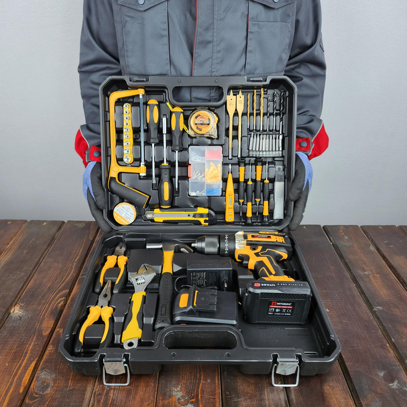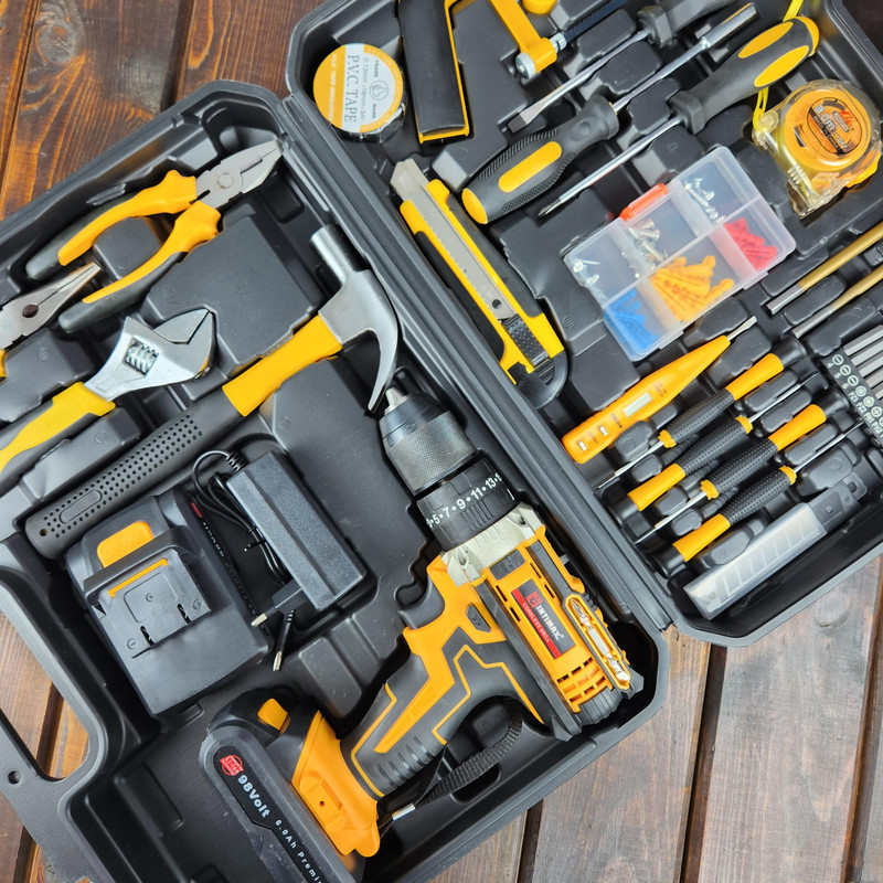 این دستگاه مجموعه ای کامل به همراه انواع ابزار الات جهت تمامی امور خانگی، اداری و … می باشد که دریلی چکشی با سه نظام 13 میلیمتری تمام فلزی دارد که برای کارهای متعدد و سخت قابل استفاده است. گیربکس این دریل تقویت شده و بسیار قدرتمند است و از عهده امور مختلف بر میآید. این دستگاه دارای دو عدد باتری لیتیوم یون 98 ولت می باشد. دریل با گشتاور فوق العاده 35 الی 60 نیوتن متر می باشد. دارای دریل با سرعت 0 الی 600 و 0 الی 1500 دور بر دقیقه می باشد.باتری ها تولید جدید و دستگاه دارای دیمر و تنظیم سرعت می باشد. دارای چراغ جهت کار در محیط های تاریک می باشد قابلیت چپگرد و راستگرد دارد دارای کلیه ابزارهای مصرفی شامل؛ آچار فرانسه سایز 8، انبردست، دمباریک، چکش، بکس تک سایز 4 تا 13 میلیمتر، متر 3 متری، پیچ گوشتی دوسو و چهارسو سایز بزرگ، مته آهن سایز 3، 4 و 5 ، مته چوب سایز 3، 4 ،5 میلیمتر، مته برگی سایز 16 و 20 ، دارای 9 عدد نوک پیچ گوشتی، تبدیل نوک پیچ گوشتی به بکس، چسب برق، کاتر، فازمتر دیجیتال، 5 عدد تیغ کاتر، دو سایز پیچ گوشتی موبایلی دو سو و دو سایز پیچ گوشتی موبایلی چهارسو، کمان اره چوب و فلز، مجموعه سایزبندی پیچ و رولپلاک می باشدکیفیت عالی می باشد همراه کیف BMC حرفه ای عرضه میگردد