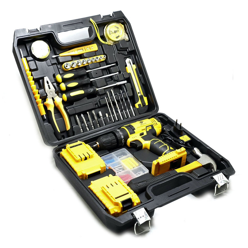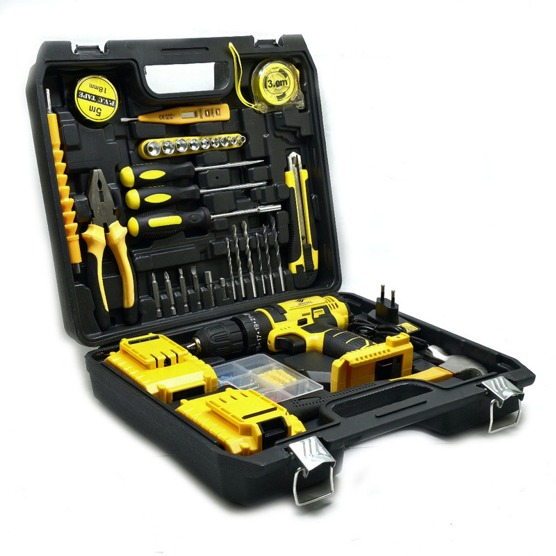 این ابزارها شامل انواع آچار، پیچ گوشتی، مته، انواع انبر، و در این مورد بخصوص دریل شارژی چکشی و… است. این ابزار ها درون جعبه مخصوصی قرار دارند که بدون بهم ریختگی قرار گرفته اند که این مجموعه ابزار را تشکیل می دهد.