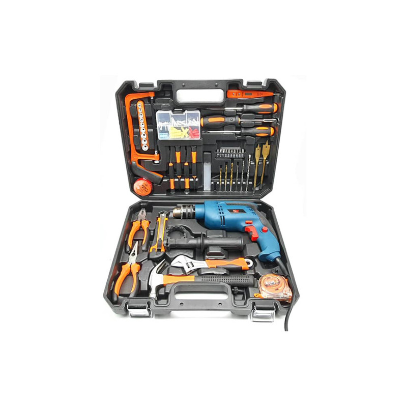 • سایر توضیحات: – یک محفظه پیچ و رولپلاک با مشخصات زیر: 10 عدد پیچ با سری چهارسو به طول 2 سانتی متر 10 عدد پیچ با سری چهارسو به طول 2.5 سانتی متر 10 عدد پیچ با سری چهارسو به طول 1.5 سانتی متر 10 عدد رولپلاک با طول 2 سانتی متر 10 عدد رولپلاک با طول 3 سانتی متر 10 عدد رولپلاک با طول 2.5 سانتی متر – 1 عدد اره کمانی با طول 26 سانتی متر و طول تیغه 14 سانتی متر – 1 عدد فازمتر دیجیتالی با طول 12.5 سانتی متر – 1 عدد چسب نواری با عرض 2 سانتی متر – 1 عدد پیچ گوشتی چهارسو با طول 20 سانتی متر و سر آهنربایی – 1 عدد پیچ گوشتی دو سو با طول 20 سانتی متر و سر آهنربایی – 1 عدد پیچ گوشتی بکس با طول 20 سانتی متر و سر آهنربایی – 2 عدد پیچ گوشتی ساعتی چهارسو با طول 14.5 سانتی متر – 2 عدد پیچ گوشتی ساعتی دو سو با طول 14.5 سانتی متر – 3 عدد سری بکس پیج گوشتی چهارسو با سایزهای VPH1 VPH2 VPH3 – عدد سری بکس پیج گوشتی چهارسو خاردار با سایزهای VPZ1 VPZ2 – 2 عدد مته گازور با سایزهای 12 16 – 3 عدد مته فلز با سایزهای 5 6 8 – 3 عدد مته الماسه با سایزهای 5 6 8 – 3 عدد تیغه یدک کاتر – 1 عدد متر 3 متری با قابلیت اندازه گیری فوت و سانتی متر (گیره دار) – 1 عدد چکش با طول 24 سانتی متر و قابلیت میخ کش (دسته عایق) – 1 عدد آچار فرانسه طول 8 اینچ و سایز دهانه 200 میلی متر – 1 عدد کاتر به طول 16 سانتی متر – 1 عدد دم باریک با طول 16 سانتی متر – 1 عدد انبر دست با طول 16 سانتی متر – 9 عدد سری بکس با سایزهای 5 6 7 8 9 10 11 12 13 میلی متر – 1 عدد دریل با مشخصات زیر: توان 650 تا 850 وات فرکانس 50/60 هرتز دور موتور 0-2600 دور در دقیقه سایز سه نظام 13 میلی متر قابلیت چکش و کنترل سرعت قابلیت قفل سوییچ – 1 عدد خط کش دریل با طول 20 سانتی متر – 1 عدد دسته دریل با طول 20 سانتی متر