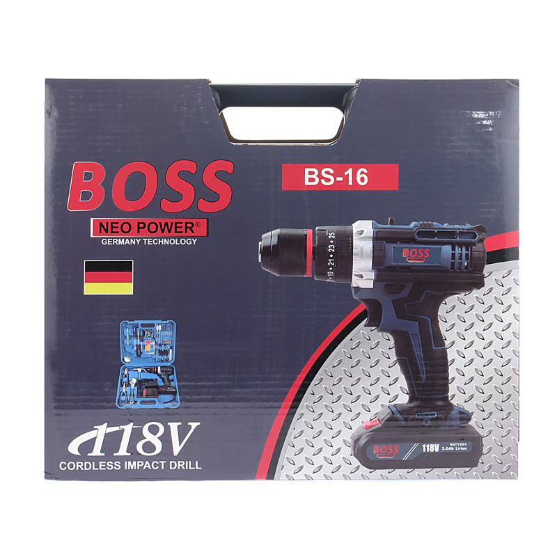دریل پیچ گوشتی شارژی چکشی باس با مشخصات زیر می باشد: ظرفیت باتری: ۲۰۰۰ mAh —- زمان شارژ شدن: ۱ ساعت —- ظرفیت سه نظام: ۰.۸-۱۰ میلی‌متر —- گیربکس دو حالته (۰-۳۵۰ و ۰-۱۳۵۰ دور در دقیقه)—- حداکثر گشتاور: ۱۸ نیوتون متر —- تعداد حالت گشتاور: ۱۸ —- دارای ال ای دی (LED)—- وزن دریل: ۱۵۰۰ گرم—- ابعاد دریل: ۱۸×۲۰×۶ سانتی‌متر—- دارای شارژر باتری دارای باتری اضافه دریل—- ۱ عدد چکش طول ۲۴ سانتی‌متر و وزن ۳۴۵ گرم (قابلیت میخ کش و دسته ضد لغزش) ۱ عدد آچار فرانسه با طول ۲۰ سانتی‌متر و دهانه ۲۴ میلی‌متری مته فلز با سایزهای ۴ ۶ ۸ ۷ عدد سری بکس با سایزهای ۱۰ ۹ ۸ ۷ ۶ ۵ ۴ ۱ عدد انبردست با طول ۱۶ سانتی‌متر ۱ عدد کاتر با طول ۱۶ سانتی‌متر ۲ عدد سری پیچ گوشتی دوسو با سایزهای ۵ ۶ ۲ عدد سری پیچ گوشتی ستاره ای با سایزهای ۱۵ ۲۰ ۲ عدد سری پیچ گوشتی چهارسوخاردار با سایزهای ۱ ۲ ۱ عدد متر ۳ متری فلزی ۳ عدد پیچ گوشتی (چهارسو، دو سو و بکس) (طول ۱۹ سانتی‌متر) ۱ عدد فازمتر با طول ۱۳.۵ سانتی‌متر و دارای گیره برای جیب ۱ عدد چسب برق ۱ عدد جعبه ابزار (دارای قفل پلاستیکی) – در نظر داشته باشید دریل های شارژی که کلکتور دارن هنگام کارکرد در قسمت هواکش دستگاه جرقه دیده میشد که این امر هنگام کارکرد در اثر برخورد زغال با کلکتور است و امری طبیعی است همچنین تمام کالاهای صنعتی همواره دارای خطو خش هستند زیرا در هنگام مونتاژ وسیله احتمال زدگی وافتادن خطو خش روی کالا و شکستگی در جعبه هنگام جابجایی بدلیل سنگینی کالا وجود داره با تشکر