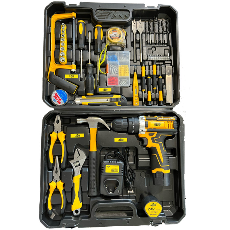 این دستگاه مجموعه ای کامل به همراه انواع ابزار الات جهت تمامی امور خانگی، اداری و … می باشد که دریلی چکشی با سه نظام 13 میلیمتری تمام فلزی دارد که برای کارهای متعدد و سخت قابل استفاده است. گیربکس این دریل تقویت شده و بسیار قدرتمند است و از عهده امور مختلف بر میآید. این دستگاه دارای دو عدد باتری لیتیوم 24 ولت می باشد. دریل با گشتاور فوق العاده 35 الی 60 نیوتن متر می باشد. دارای دریل با سرعت 0 الی 600 و 0 الی 1500 دور بر دقیقه می باشد.باتری ها تولید جدید و دستگاه دارای دیمر و تنظیم سرعت می باشد. دارای چراغ جهت کار در محیط های تاریک می باشد قابلیت چپگرد و راستگرد دارد دارای کلیه ابزارهای مصرفی شامل؛ آچار فرانسه سایز 8، انبردست، دمباریک، چکش، بکس تک سایز 4 تا 13 میلیمتر، متر 3 متری، پیچ گوشتی دوسو و چهارسو سایز بزرگ، مته آهن سایز 3، 4 و 5 ، مته چوب سایز 3، 4 ،5 میلیمتر، مته برگی سایز 16 و 20 ، دارای 9 عدد نوک پیچ گوشتی، تبدیل نوک پیچ گوشتی به بکس، چسب برق، کاتر، فازمتر دیجیتال، 5 عدد تیغ کاتر، دو سایز پیچ گوشتی موبایلی دو سو و دو سایز پیچ گوشتی موبایلی چهارسو، کمان اره چوب و فلز، مجموعه سایزبندی پیچ و رولپلاک می باشدکیفیت عالی می باشد همراه کیف BMC حرفه ای عرضه میگردد