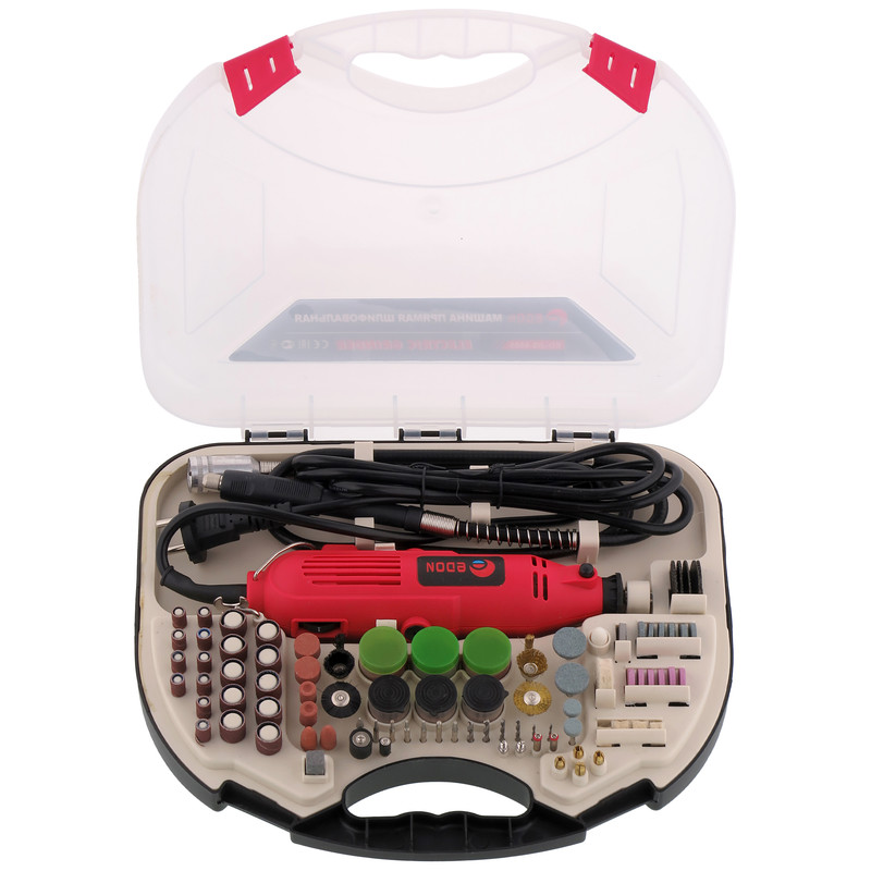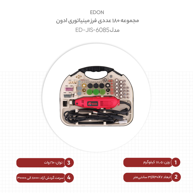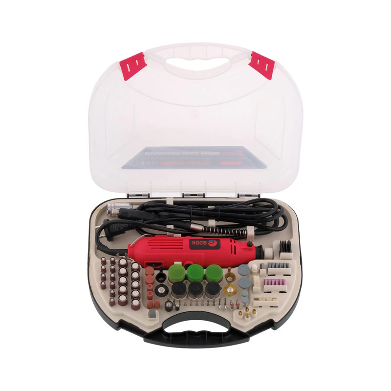 - سایر توضیحات: برند: ادون EDON کاربرد: حکاکی فلز و سنگ و چوب دارای 180 عدد سری مختلف قابلیت برش با زاویه: دارد امکان اضافه کردن مته تا سایز 6mm قطر سه نظام : 3.2 م.م سرعت گردش آزاد: 8000 الی 30000 دور در دقیقه دارای قابلیت تغییر سرعت ( دیمردار) دارای فرز خرطومی دارای قفل جهت تعويض ابزار بدون آچار دارای کاور پلاستیکی دستهدار