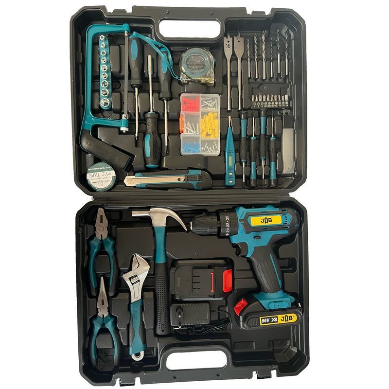 این دستگاه مجموعه ای کامل به همراه انواع ابزار الات جهت تمامی امور خانگی، اداری و … می باشد که دریلی چکشی با سه نظام 10 میلیمتری دارد که برای کارهای متعدد و سخت قابل استفاده است. گیربکس این دریل تقویت شده و بسیار قدرتمند است و از عهده امور مختلف بر میآید. این دستگاه دارای دو عدد باتری لیتیوم 24 ولت می باشد. دریل با گشتاور فوق العاده 35 الی 60 نیوتن متر می باشد. دارای دریل با سرعت 0 الی 600 و 0 الی 2500 دور بر دقیقه می باشد.باتری ها تولید جدید و دستگاه دارای دیمر و تنظیم سرعت می باشد. دارای چراغ جهت کار در محیط های تاریک می باشد قابلیت چپگرد و راستگرد دارد دارای کلیه ابزارهای مصرفی شامل؛ آچار فرانسه سایز 8، انبردست، دمباریک، چکش، بکس تک سایز 4 تا 13 میلیمتر، متر 3 متری، پیچ گوشتی دوسو و چهارسو سایز بزرگ، مته آهن سایز 3، 4 و 5 ، مته چوب سایز 3، 4 ،5 میلیمتر، مته برگی سایز 16 و 20 ، دارای 9 عدد نوک پیچ گوشتی، تبدیل نوک پیچ گوشتی به بکس، چسب برق، کاتر، فازمتر دیجیتال، 5 عدد تیغ کاتر، دو سایز پیچ گوشتی موبایلی دو سو و دو سایز پیچ گوشتی موبایلی چهارسو، کمان اره چوب و فلز، مجموعه سایزبندی پیچ و رولپلاک می باشدکیفیت عالی می باشد همراه کیف BMC حرفه ای عرضه میگردد
