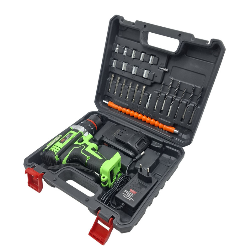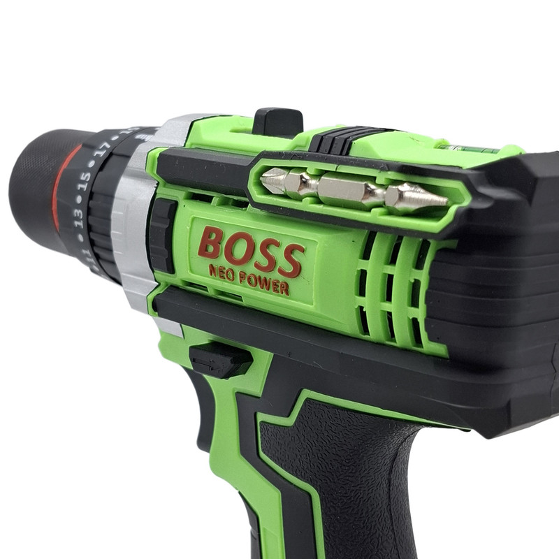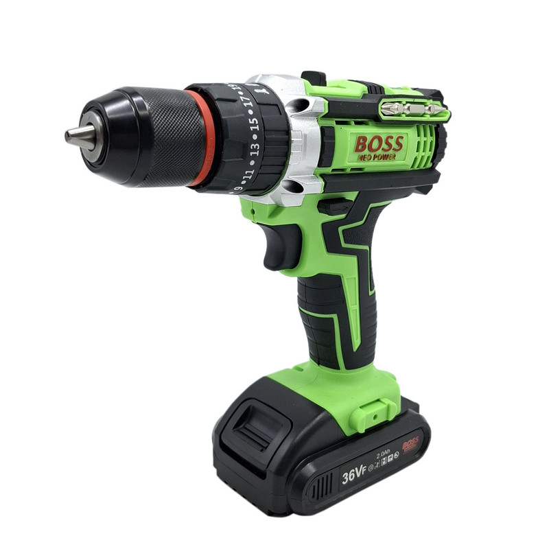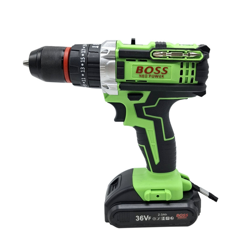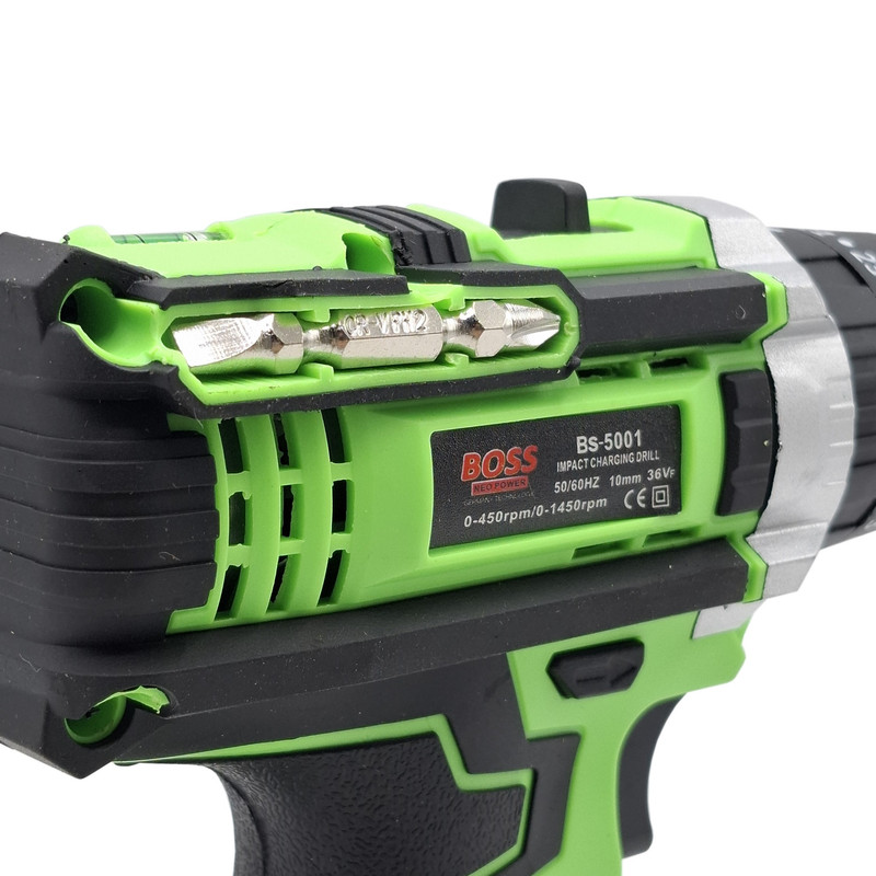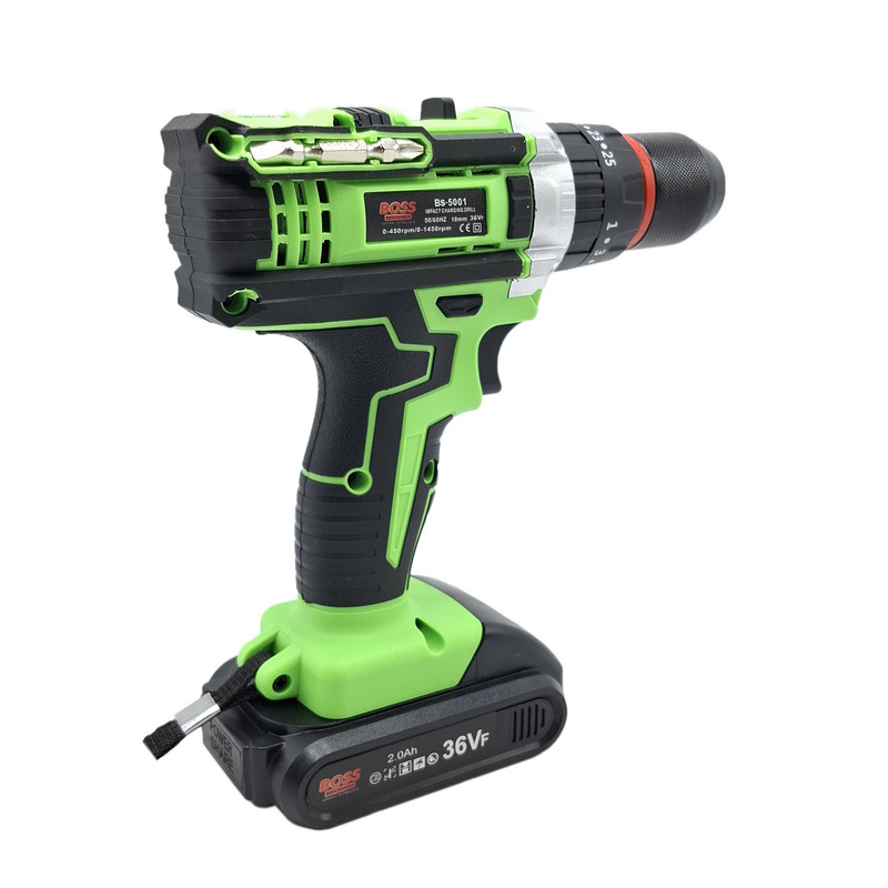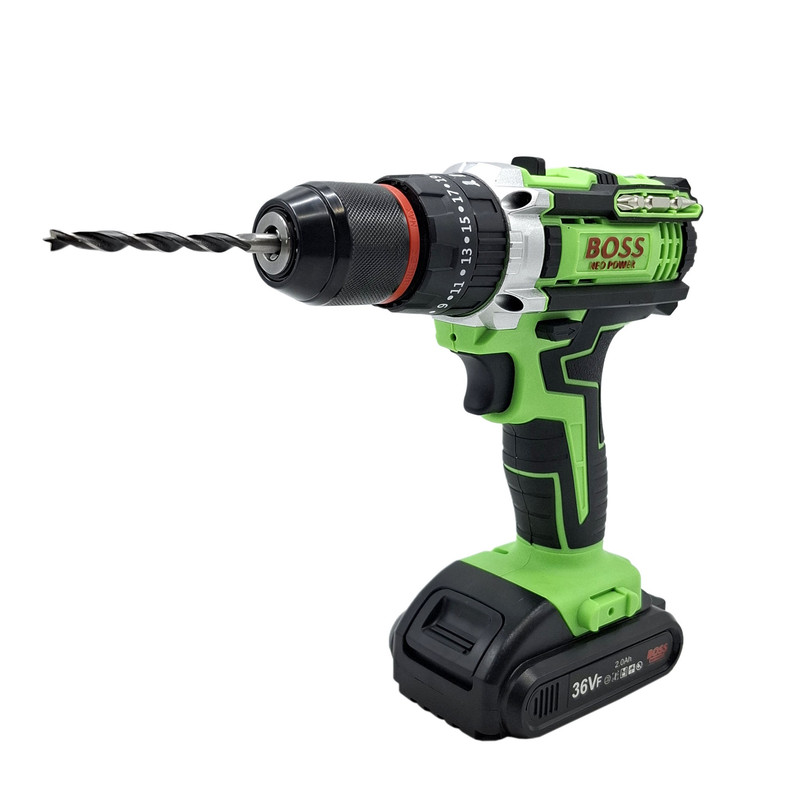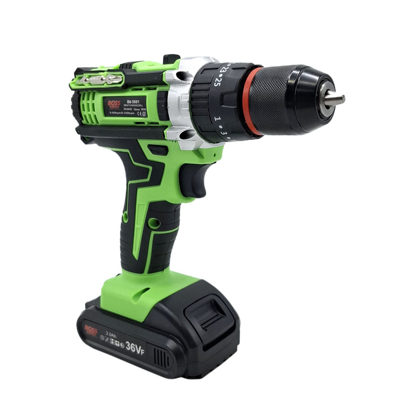مشخصات دریل شارژی چکشی 36 ولت تک باتری با لوازم باس: این محصول ساخت کشور چین می باشد که دارای ترک متر (هرزگرد) 25 پله ای و دارای 2 سرعت می باشد این محصول دارای کلید چپ گرد و راست گرد و نیز کلید گازی(با فشار دست سرعت کم و زیاد می شود ) می باشد همچنین باطری این محصول 36 ولت بوده – این دریل دارای سه نظام 10 میلیمتر تمام فلزی اتوماتیک می باشد که قابلیت چکشی دارد – این دریل علاوه بر سوراخکاری برای پولیش کاری هم قابل استفاده می باشد. دریلی قوی با قابلیت عملکرد در سه حالت مجزا، اعم از سوراخکاری، سوراخکاری چکشی و به عنوان پیچ گوشتی برقی می باشد – مجهز به موتوری بسیار قوی با عملکرد عالی و طول عمر بالا می باشد – دارای بدنه ای ارگونومیک با استحکامی فوق العاده می باشد -مجهز به کلاچ تنظیم دستگاه در گشتاورهای مختلف، برای جلوگیری از ورود آسیب به سطح کار می باشد – دارای حداکثر گشتاور 50 الی 100 نیوتن متری با قدرتی عالی و عملکردی بی نظیر می باشد – قابل تنظیم دو دور سرعت (0 الی 450 و 0 الی 1450 دور بر دقیقه) متفاوت جهت استفاده بر سطوح مختلف را دارد – دارای حداکثر تعداد ضربه در حالت چکشی برای نفوذ آسان به متراکم ترین سطوح می باشد – دارای گیربکس فلزی مستحکم با طول عمر بالا جهت بهره گیری در فعالیت های پرفشار می باشد – دارای طراحی منحصر بفرد بدنه با روکشی از جنس رابر باکیفیت، مقاوم در برابر ورود انواع ضربات و سقوط از دست کاربر می باشد –