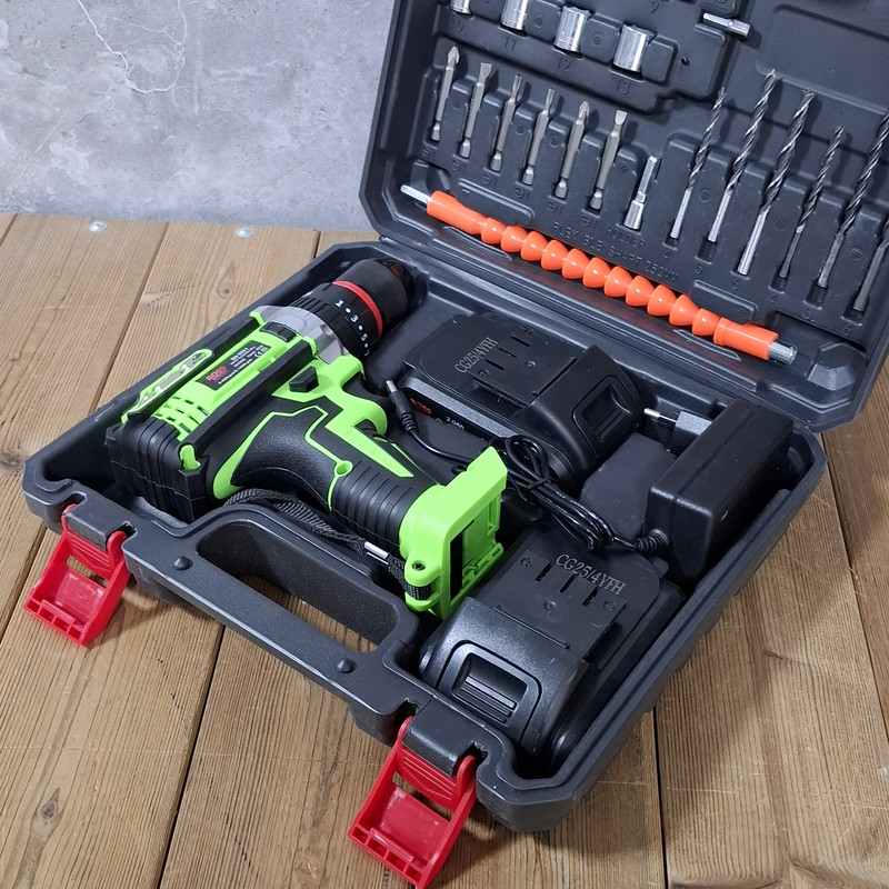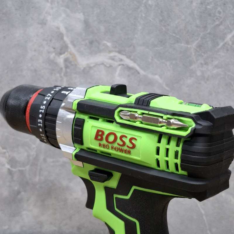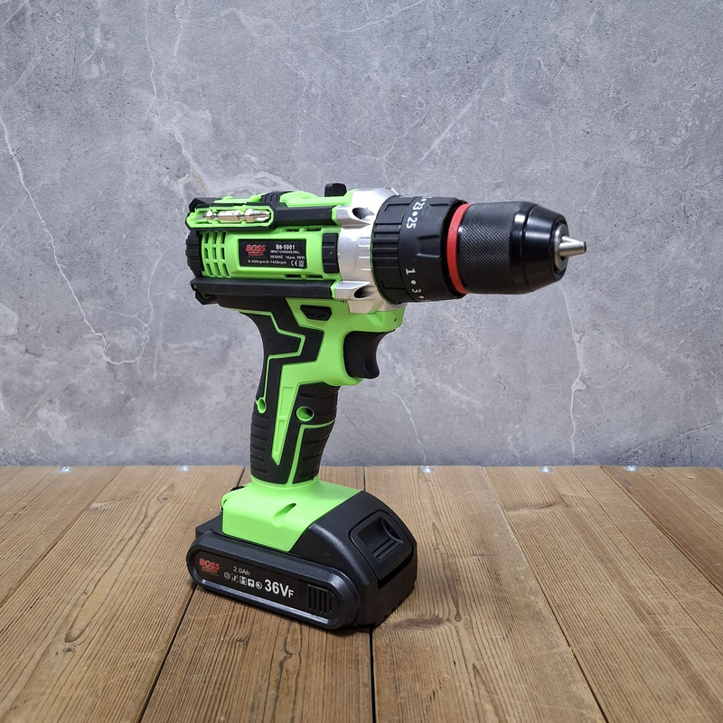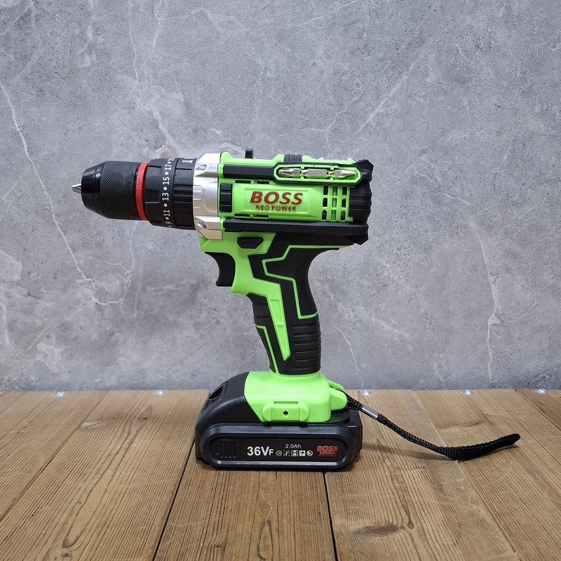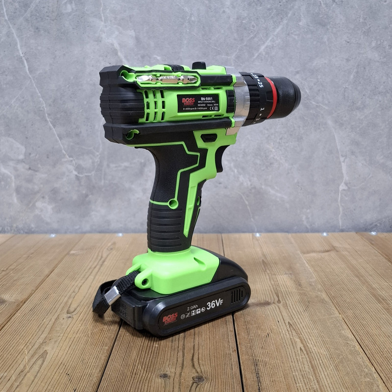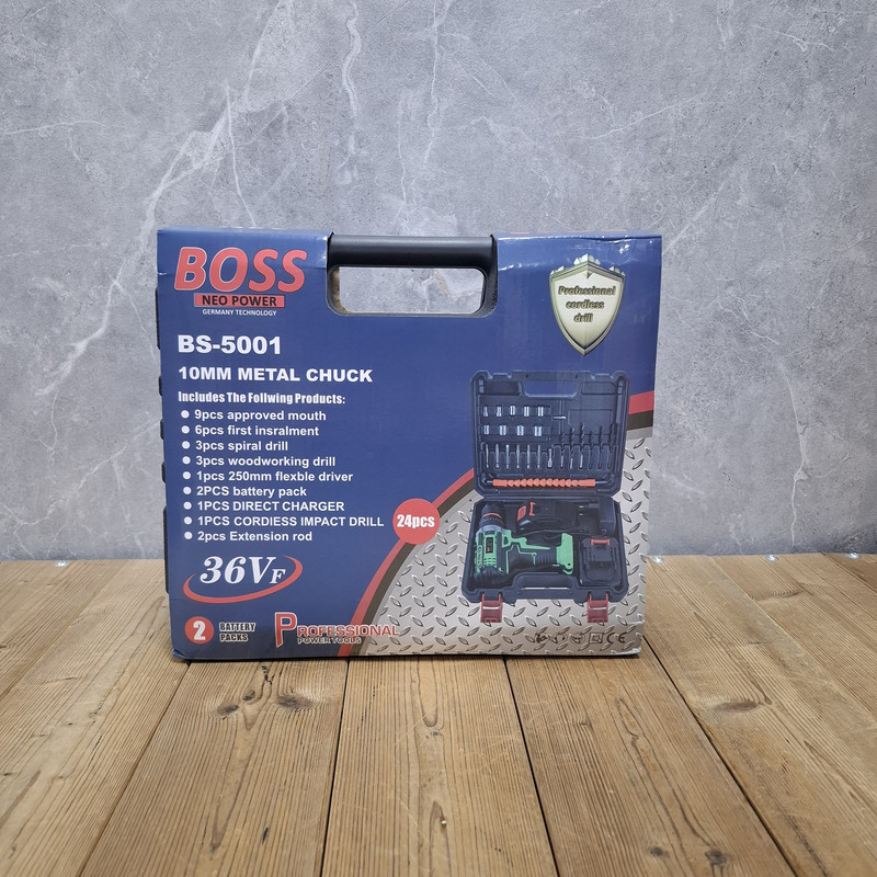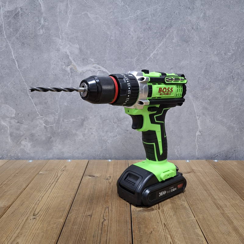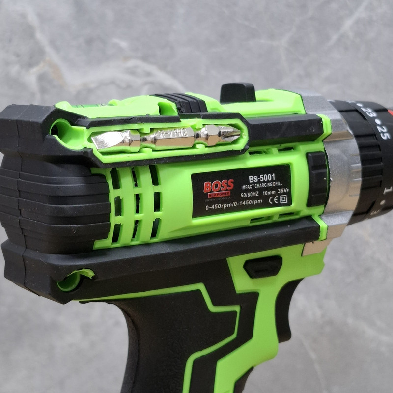 مشخصات دریل شارژی چکشی 36 ولت دو باتری با لوازم باس: این محصول ساخت کشور چین می باشد که دارای ترک متر (هرزگرد) 25 پله ای و دارای 2 سرعت می باشد این محصول دارای کلید چپ گرد و راست گرد و نیز کلید گازی(با فشار دست سرعت کم و زیاد می شود ) می باشد همچنین باطری های این محصول 36 ولت بوده – این دریل دارای سه نظام 10 میلیمتر تمام فلزی اتوماتیک می باشد که قابلیت چکشی دارد – این دریل علاوه بر سوراخکاری برای پولیش کاری هم قابل استفاده می باشد. دریلی قوی با قابلیت عملکرد در سه حالت مجزا، اعم از سوراخکاری، سوراخکاری چکشی و به عنوان پیچ گوشتی برقی می باشد – مجهز به موتوری بسیار قوی با عملکرد عالی و طول عمر بالا می باشد – دارای بدنه ای ارگونومیک با استحکامی فوق العاده می باشد -مجهز به کلاچ تنظیم دستگاه در گشتاورهای مختلف، برای جلوگیری از ورود آسیب به سطح کار می باشد – دارای حداکثر گشتاور 50 الی 100 نیوتن متری با قدرتی عالی و عملکردی بی نظیر می باشد – قابل تنظیم دو دور سرعت (0 الی 450 و 0 الی 1450 دور بر دقیقه) متفاوت جهت استفاده بر سطوح مختلف را دارد – دارای حداکثر تعداد ضربه در حالت چکشی برای نفوذ آسان به متراکم ترین سطوح می باشد – دارای گیربکس فلزی مستحکم با طول عمر بالا جهت بهره گیری در فعالیت های پرفشار می باشد – دارای طراحی منحصر بفرد بدنه با روکشی از جنس رابر باکیفیت، مقاوم در برابر ورود انواع ضربات و سقوط از دست کاربر می باشد –