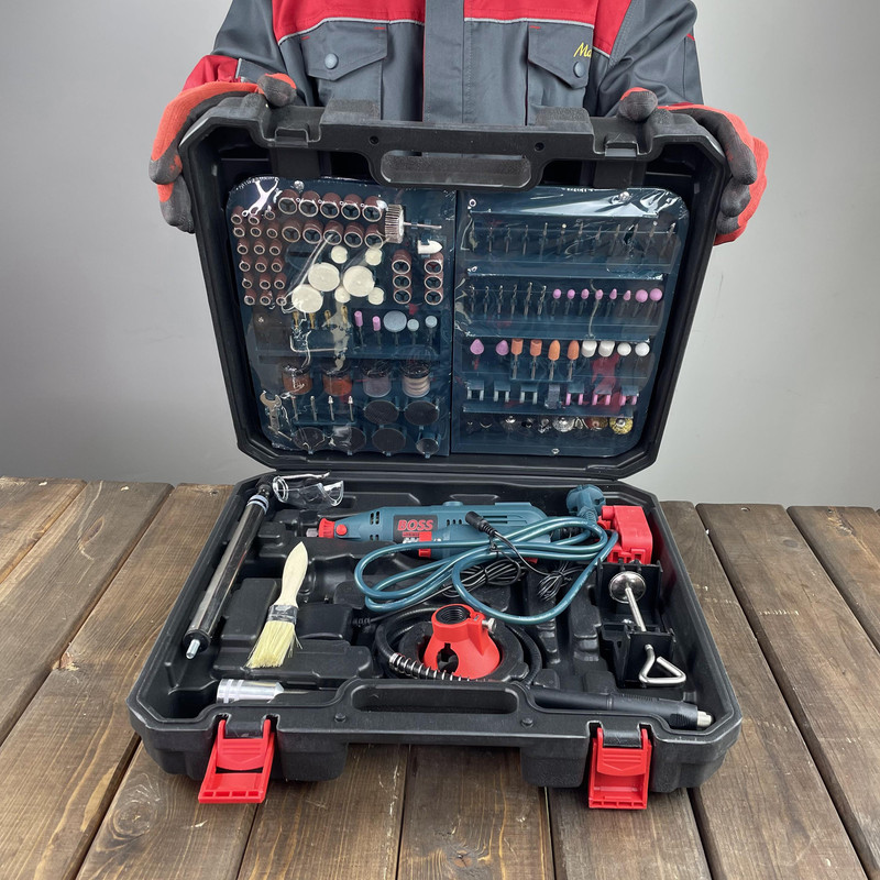 این محصول، یک فرز مینیاتوری به همراه مجموعهی کاملی از ابزار و وسایلی است که برای انجام کارهای مختلف، مورداستفاده قرار میگیرد. این دستگاه به یک موتور، با قدرت مناسب مجهز است که میتوان سرعت گردش آن را بهصورت دیجیتالی تنظیم کنید. انواع کولت برای کار در شرایط مختلف برای این محصول در نظر گرفتهشده است. علاوه بر این تعداد زیادی از انواع لوازم جانبی به همراه این ابزار عرضه میشود. فرز مینیاتوری فوق یک دستگاه چندکاره بهحساب میآید. از این دستگاه غالبا برای انجام کارهایی با دقت و ظرافت بالا استفاده میشود. ازجمله این موارد میتوان به برشهای دقیق فلزات و چوب، دادن طرحهای مختلف در چوب، انواع سوهانکاری و بسیاری موارد دیگر اشاره کرد. این محصول موتوری با قدرت 200 وات دارد. حداکثر سرعت گردش موتور به 38000 دوربردقیقه میرسد. سرعت گردش موتور دستگاه را میتوان به کمک بخش دیجیتالی انتهای دسته بین 8000 تا 38000 دوربردقیقه تنظیم کرد. با توجه به اینکه کاربرد این دستگاه در انجام کارهایی با ظرافت بالا است، میتوان با اتصال یکی از انواع کولت (سری دستگاه) به محصول، نیاز به در دست گرفتن دستگاه را برطرف کرد. در کنار این محصول 370 عدد لوازم جانبی هم وجود دارد. گونههای مختلف سنگ سنباده و برش، متههایی با قطر بسیار کم، صفحههای سنباده، فرچه و انواع پایههای مخصوص دستگاه در بیت این 370 عدد لوازم جانبی دیده میشود. با استفاده از پایههای قرارگرفته در این مجموعه، میتوانید دستگاه را به چند حالت معلق، روی میز و عمودی استفاده کرد. در شغلهای مختلفی از فرزهای مینیاتوری استفاده میکنند. ازجملهی این مشاغل که در آن از این نوع فرز استفادهی بسیار زیادی میکنند، تولیدکنندگان دکورهای چوبی و فلزی هستند. شرکت باس هم نمونههایی از این دستگاه را تولید کرده است. شاید کیفیت ساخت محصولات باس، در حد برندهای خارجی نظیر بوش نباشد، اما با در نظر گرفتن قیمت و سطح کیفی ، تهیهی این محصول مقرونبهصرفه به نظر میرسد. فرزهای مینیاتوری فوق ساخت شرکت باس است که با یک موتور 200 واتی و یک دستگاه 100 واتی کار میکند.