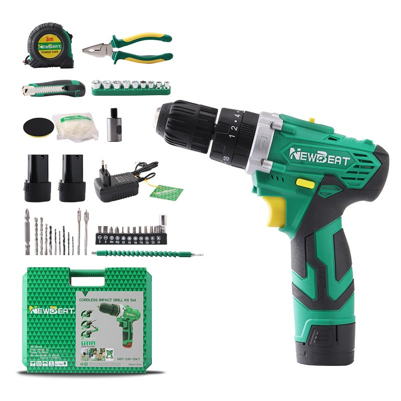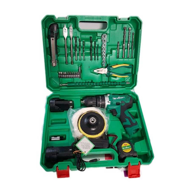 دریل پیچ بند چکشی شارژی نیوبیت با 2 باطری به همراه 43 عدد لوازم شامل رابط پیچ گوشتی خرطومی به طول 25 سانتی متر، پولیش و پد پولش ، نوک سایز های مختلف چهارسو ، دو سو ، ستاره ای و … ، 9 عدد مته آهن و دیوار و دو سایز مته برگی ، 9 عدد بکس سایز های مختلف ، انبردست با کیفیت عالی ، متر 3 متری با کیفیت ، کاتر ، دو عدد باتری ، شارژر ، دفترچه راهنما می باشد لازم به ذکر است ظرفیت باتری 1500 میلی آمپر ساعت (mAh) و ولتاژ باتری 12 ولت و سایز سه نظام دستگاه 10 میلی متر و اتوماتیک بوده و حداکثر ظرفیت دریل کاری در آهن: 10 میلی متر و در چوب: 22 میلی متر می باشد.این دستگاه دارای حداکثر گشتاور 30 نیوتن متر و دارای کلید چپ گرد و راست گرد است. همچنین دستگاه دارای لامپ LED و کیف BMC می باشد.