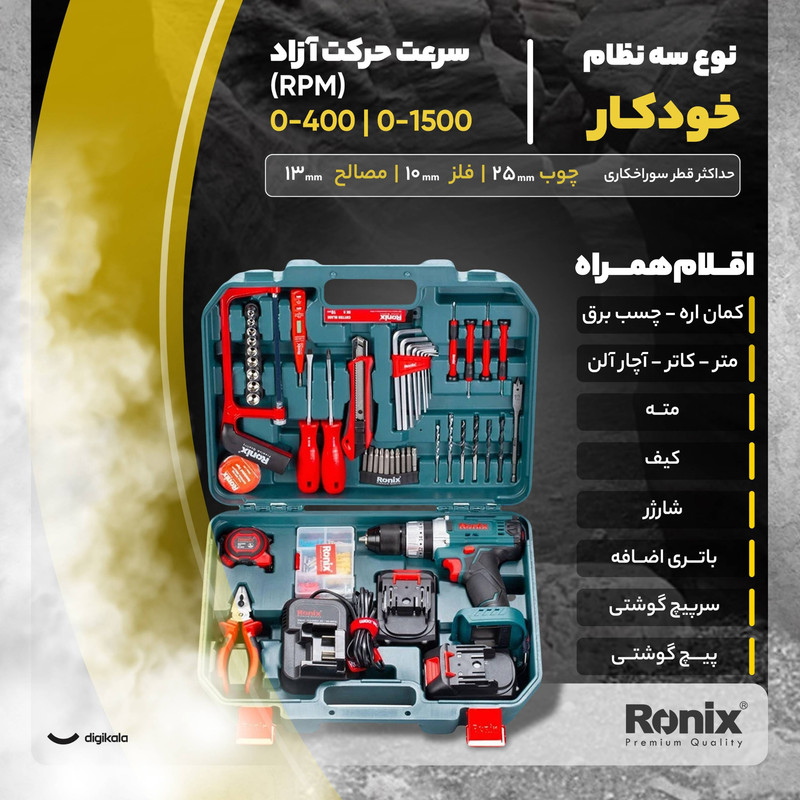 مجموعه 53 عددی دریل پیچگوشتی شارژی چکشی رونیکس مدل RS-8620