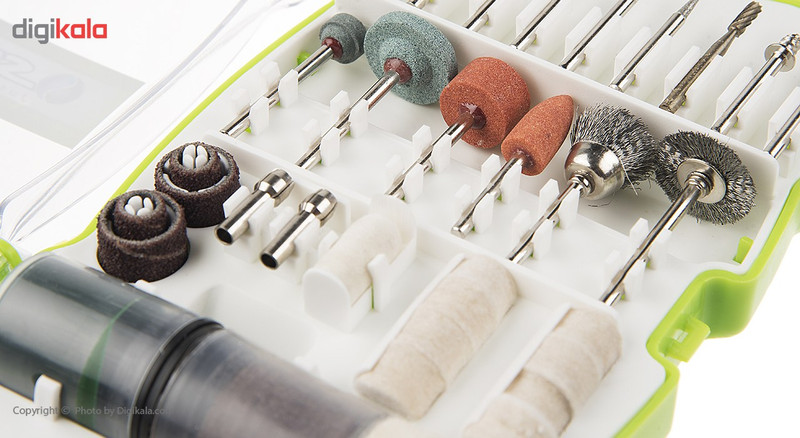 | سایر توضیحات | – دارای 70 قلم ابزار مجزا جهت سوراخکاری، صیقل و ساب – 17 عدد سری، 2 عدد کولت و نمد – ابعاد بستهبندی: 12 × 3.5 × 22 سانتیمتر – وزن بستهبندی: 282 گرم |