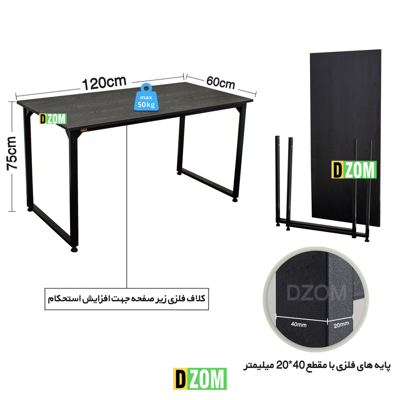 صفحه میز از MDF درجهیک برجسته طرح چوب و به رنگ مشکی است. این محصول با طول 120cm، عرض 60cm و ارتفاع 75cm عرضه میشود.