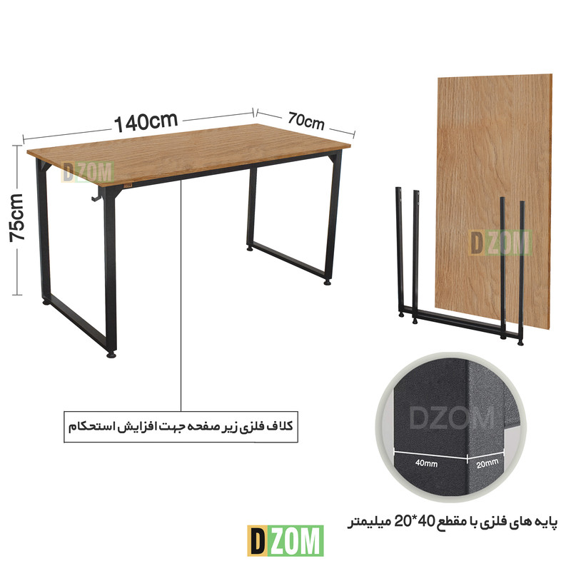 میز اداری دیزم DZom مدل مونتاژی TLD_asm_140×70_LIGHT محصولی مونتاژی، سبک، شیک و در عین حال جذاب و کارآمد از سری تولیدات دیزم میباشد. این محصول بصورت سلف اسمبل (مونتاژی) تولید شده است. ویژگی ممتاز این میز حمل و نقل آسان آن است. سلف اسمبل بودن محصول باعث شده است تا هزینه حمل و نقل آن بسیار مناسب و مقرون به صرفه شود. این میز از پایه های فلزی با مقطع 40×20 میلیمتر و رنگ رویه الکترواستاتیک با ماندگاری و دوام بالا ساخته شده است. همچنین پایه های پیچی، قابلیت تنظیم نسبت به سطح زمین را دارد تا بهترین تراز جهت جلوگیری از تکان خوردن را ایجاد نماید. صفحه میز از جنس MDF درجه یک برجسته طرح چوب به رنگ قهوه ای روشن می باشد. این محصول با طول 140cm، عرض 70cm و ارتفاع 75cm عرضه می شود. به این نکته توجه شود که تنوع رنگ انتخابی کالا تنها مربوط به رنگ پایه های فلزی میباشد.