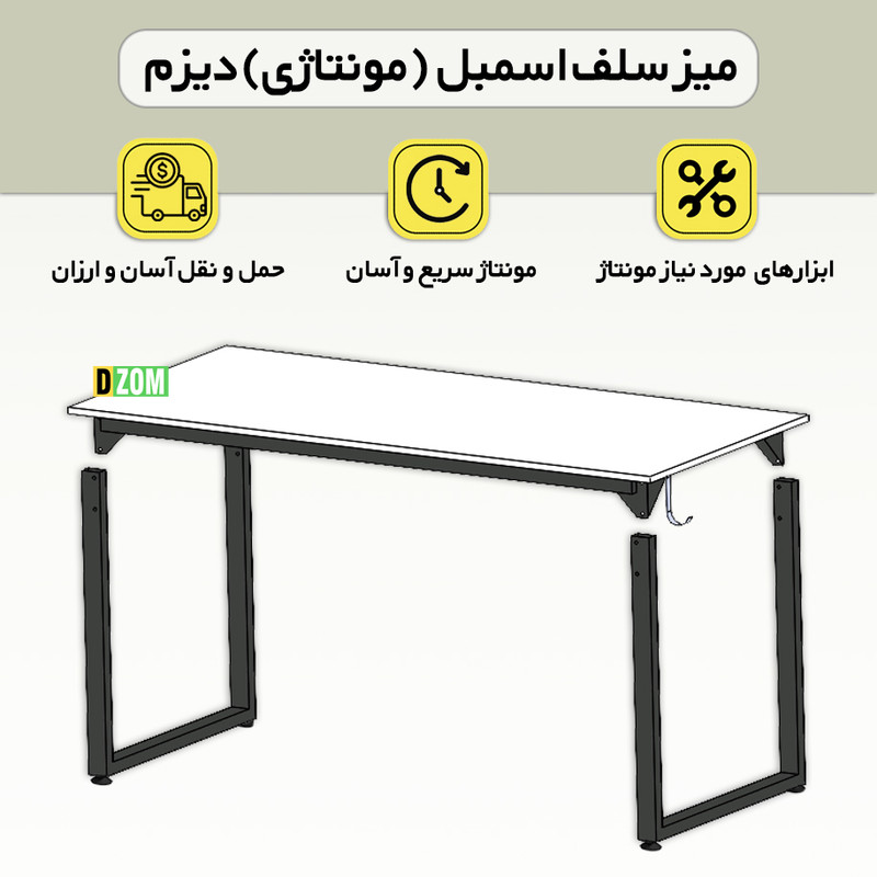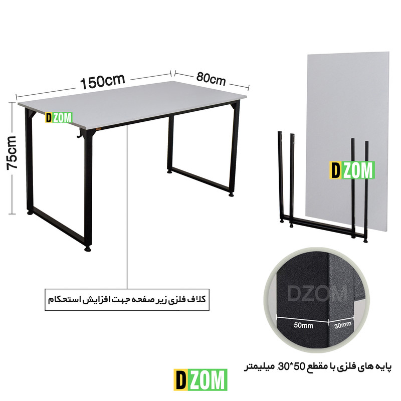 میز اداری دیزم DZom مدل مونتاژی TLD_asm_150×80_W محصولی مونتاژی، سبک، شیک و در عین حال جذاب و کارآمد از سری تولیدات دیزم میباشد. این محصول بصورت سلف اسمبل (مونتاژی) تولید شده است. این میز حمل و نقل آسان و هزینه حمل مقرون به صرفه ای دارد. این میز از پایه های فلزی با مقطع 50×30 میلیمتر و رنگ رویه الکترواستاتیک با ماندگاری و دوام بالا ساخته شده است. همچنین پایه های پیچی، قابلیت تنظیم نسبت به سطح زمین را دارد تا بهترین تراز جهت جلوگیری از تکان خوردن را ایجاد نماید. صفحه میز از جنس MDF درجه یک برجسته طرح چوب به رنگ سفید می باشد. این محصول با طول 150cm، عرض 80cm و ارتفاع 75cm عرضه می شود. به این نکته توجه شود که تنوع رنگ انتخابی کالا تنها مربوط به رنگ پایه های فلزی میباشد.