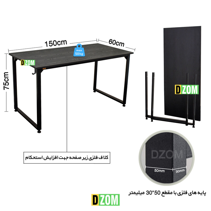 میز مدیریت دیزم DZom مدل مونتاژی TLD_asm_150×60_B محصولی مونتاژی، سبک، شیک و در عین‌حال جذاب و کارآمد از سری تولیدات دیزم است. این محصول به‌صورت سلف‌اسمبل (مونتاژی) تولید شده است. این میز حمل‌ونقل آسان و هزینه‌ی حمل مقرون‌به‌صرفه‌ای دارد. مشتری گرامی توجه نمایید محصولات برند دیزم (شماره ثبت 414013 اداره‌ی ثبت علائم تجاری) با کیفیت و بسته‌بندی اصلی تنها توسط فروشنده‌ی رسمی دیزم در دیجی‌کالا عرضه می‌شود، لطفاً از خرید کالای تقلبی از سایر فروشندگان خودداری فرمایید. این میز از پایه‌های فلزی با مقطع 50×30 میلی‌متر و رنگ رویه‌ی الکترواستاتیک با ماندگاری و دوام بالا ساخته شده است. همچنین پایه‌های پیچی قابلیت تنظیم نسبت‌به سطح زمین را دارد تا بهترین تراز جهت جلوگیری از تکان‌خوردن را ایجاد نماید. صفحه‌ی میز از جنس MDF درجه‌یک برجسته طرح چوب به رنگ مشکی است. این محصول با طول 150cm، عرض 60cm و ارتفاع 75cm عرضه می‌شود. به این نکته توجه شود که تنوع رنگ انتخابی کالا تنها مربوط به رنگ پایه‌های فلزی است.