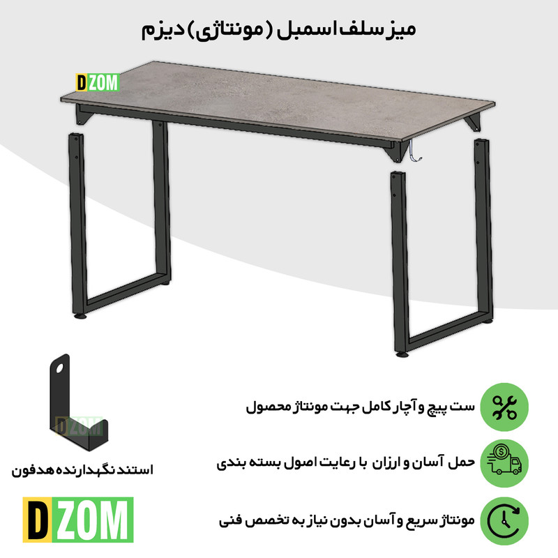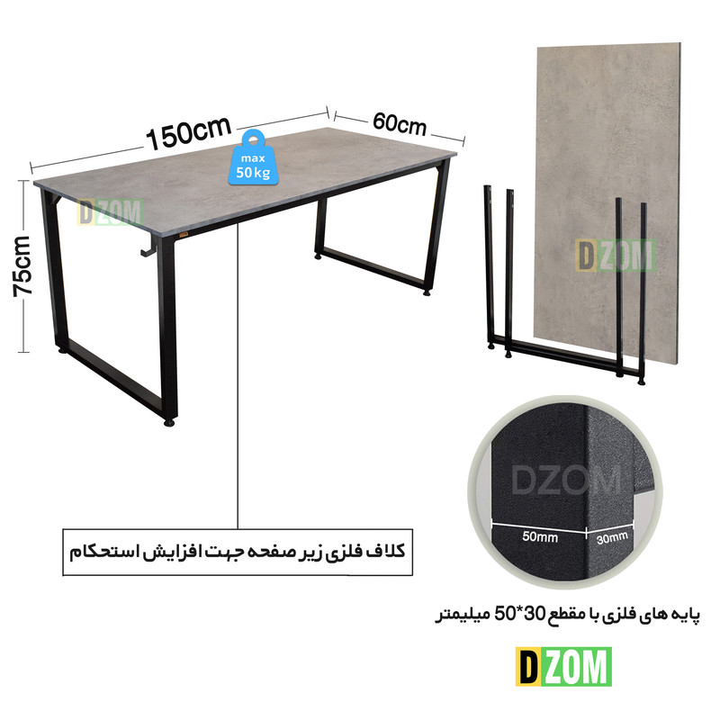 میز مدیریت دیزم DZom مدل مونتاژی TLD_asm_150×60_GR محصولی مونتاژی، سبک، شیک و در عین حال جذاب و کارآمد از سری تولیدات دیزم میباشد. این محصول بصورت سلف اسمبل (مونتاژی) تولید شده است. این میز حمل و نقل آسان و هزینه حمل مقرون به صرفه ای دارد. مشتری گرامی توجه نمایید محصولات برند دیزم (شماره ثبت 414013 اداره ثبت علائم تجاری) با کیفیت و بسته بندی اصلی تنها توسط فروشنده رسمی دیزم در دیجیکالا عرضه میشود، لطفاً از خرید کالای تقلبی از سایر فروشندگان خودداری فرمایید. این میز از پایه های فلزی با مقطع 50×30 میلیمتر و رنگ رویه الکترواستاتیک با ماندگاری و دوام بالا ساخته شده است. همچنین پایه های پیچی، قابلیت تنظیم نسبت به سطح زمین را دارد تا بهترین تراز جهت جلوگیری از تکان خوردن را ایجاد نماید. صفحه میز از جنس MDF درجه یک به رنگ طوسی می باشد. این محصول با طول 150cm، عرض 60cm و ارتفاع 75cm عرضه می شود. به این نکته توجه شود که تنوع رنگ انتخابی کالا تنها مربوط به رنگ پایه های فلزی میباشد.