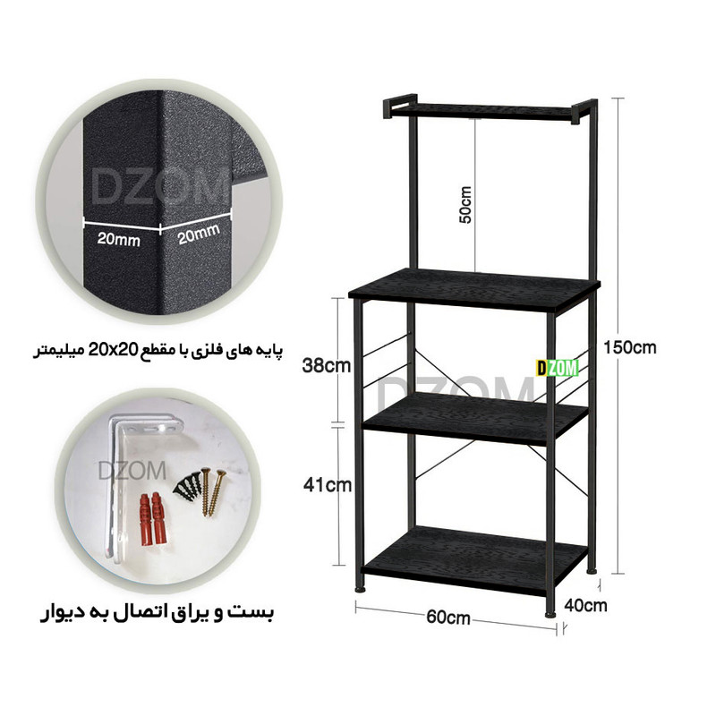 کافی بار اداری دیزم DZom مدل OF_F100_60_B محصولی سبک، شیک و در عین حال جذاب و کارآمد از سری تولیدات دیزم میباشد. این محصول از پایه های فلزی با مقطع 20×20 میلیمتر و رنگ رویه الکترواستاتیک با ماندگاری و دوام بالا ساخته شده است. همچنین پایه های پیچی، قابلیت تنظیم نسبت به سطح زمین را دارد تا بهترین تراز جهت جلوگیری از تکان خوردن را ایجاد نماید. صفحه محصول از جنس MDF درجه یک برجسته طرح چوب به رنگ مشکی می باشد. این محصول با طول 60cm، عرض 40cm و ارتفاع 150cm عرضه می شود. به این نکته توجه شود که تنوع رنگ انتخابی کالا تنها مربوط به رنگ پایه های فلزی میباشد و محصول به صورت کاملا مونتاژ شده و آماده استفاده برای مشتریان ارسال می گردد. توصیه میشود جهت حفظ ایمنی و ثبات بیشتر، محصول در یک یا دو نقطه به دیوار پیچ گرد.(یراق اتصال داخل بسته بندی موجود است).