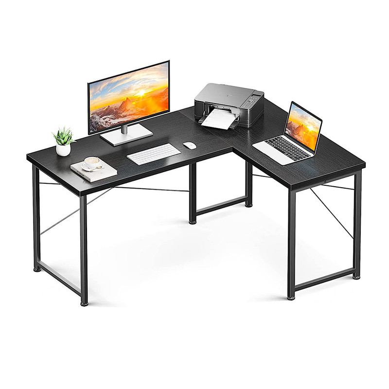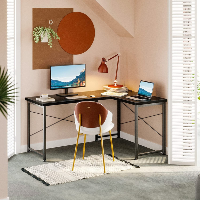 میز جادار که با پایه فلزی شیک قرار گرفته است، به شکل L، محیط کاری راحت را فراهم می کند که بهره وری را افزایش می دهد.