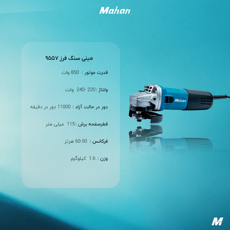 مینی سنگ‌فرز ماهان 9557 یک ابزار پرقدرت و باکیفیت برای برش و سابیدن انواع مواد است. این دستگاه دارای توان 850 وات و سرعت دوران 11000 دور در دقیقه می‌باشد. قطر دیسک قابل استفاده در این مدل 115 میلی‌متر است که برای برش فلزات، سنگ و سرامیک مناسب است. طراحی ارگونومیک آن کمک می‌کند تا کاربر در حین استفاده احساس راحتی بیشتری داشته باشد. همچنین، این دستگاه به سیستم قفل محور برای آسانی تعویض دیسک مجهز است. محافظ دیسک آن، ایمنی کاربر را بالا می‌برد و از پرتاب مواد جلوگیری می‌کند. وزن سبک این دستگاه، حدود 1.6 کیلوگرم، امکان جابه‌جایی آسان را فراهم می‌آورد. مینی سنگ‌فرز ماهان 9557 در کارگاه‌های ساختمانی و نصب و راه‌اندازی تأسیسات کاربرد فراوانی دارد. برای ایمنی بیشتر، استفاده از عینک و دستکش محافظ توصیه می‌شود. این ابزار به عنوان یکی از انتخاب‌های محبوب در میان حرفه‌ای‌ها و صنعتگران شناخته می‌شود.