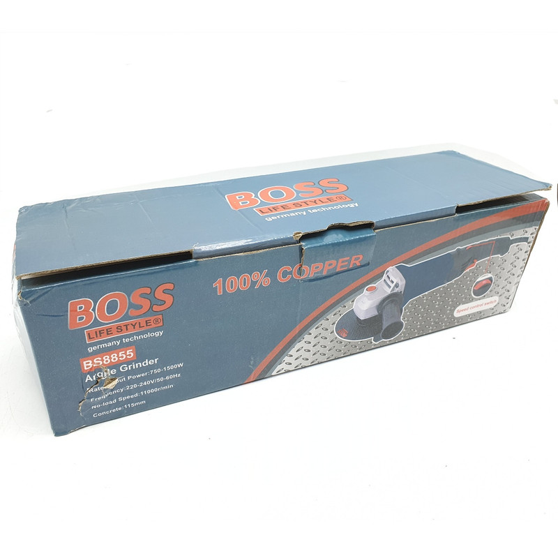 • سایر توضیحات: اگر بخواهیم برش و سنباده زدن فلزات را به کمک دستگاه‌های برقی انجام دهیم، دستگاه فرز یکی از گزینه‌های موجود است. این دستگاه کاربرد بسیار زیادی در خصوص برش یا سنباده زدن فلزات دارد. این ابزار در گونه‌های مختلفی تولید و به بازار عرضه‌شده است که مینی‌فرز یکی ازاین‌گونه‌ها است. از مینی‌فرز در جاهایی که با محدودیت فضا مواجه هستیم استفاده می‌شود. علاوه بر این حجم کم این نوع فرز باعث می‌شود تا کاربر راحت‌تر از دستگاه‌های فرز معمولی یا بزرگ، از مینی‌فرز استفاده کند. دستگاهی را که به شما معرفی می‌کنیم یکی از مینی‌فرز‌های تولیدشده توسط شرکت باس محسوب می‌شود. این مینی‌فرز بدنه‌ای متفاوتی نسبت به سایر مینی‌فرزهای موجود در بازار دارد. مدل BS8855 یک مینی‌فرز 1500 واتی است.صفحه‌ی فرز این دستگاه در حالت آزاد با سرعت 11000 دوربردقیقه می‌چرخد. برای استفاده از این محصول مانند بسیاری از مینی‌فرزها باید از صفحه‌ی فرز با قطر 125 میلی‌متر استفاده کنید. این مدل مجهز به سیستمی است که باعث می‌شود گریس به‌صورت مداوم در میان چرخ‌دنده‌ها وجود داشته باشد؛ این موضوع کارایی و عمر دستگاه را افزایش می‌دهد. بدنه‌ی مدل BS8855 نسبت به بیشتر مینی‌فرزها متفاوت است. شکل بدنه‌ی این محصول طول بلندی دارد و به کاربر در استفاده‌ی راحت‌تر از دستگاه کمک می‌کند. دسته‌ی کمکی پلاستیکی این دستگاه را می‌توانید از سه جهت به دستگاه متصل کنید. شرکت BOSS یکی از تولیدکنندگان خارجی ابزار است که محصولات بسیار متنوعی در این زمینه تولید کرده و برای حفظ جایگاه خود در بازار با شرکت‌هایی نظیر نووا و توسن رقابتی تنگاتنگ دارد.