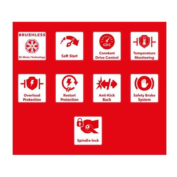 -شماره فنی: 534017-ساخت کارخانه فلکس آلمان در چین -بکارگیری کنترلر پیشرفته میکروپروسسور شامل Soft Start، Restart protection، CDC(Constant drive control) ,Anti-Kickback، temperature monitoring ,Overload protection-قفل اسپیندل -تنظیم گارد بدون نیاز به ابزار -موتور براشلس -به کمک ترمز مکانیکی ابزار در 3.5 ثانیه متوقف میشود.-محافظت موتور و گیربکس در مقابل گرد و غبار-طراحی دسته خاص جهت کاهش مقاومت هوا برای دست گیری عالی – -طول کابل: ۴ متر-توان ورودی:2000 وات-توان خروجی:1500وات-حداکثر قطر صفحه:۱۲۵ میلیمتر-حداکثر سرعت بدون بار:11000دور در دقیقه-وزن:2.75 کیلوگرم