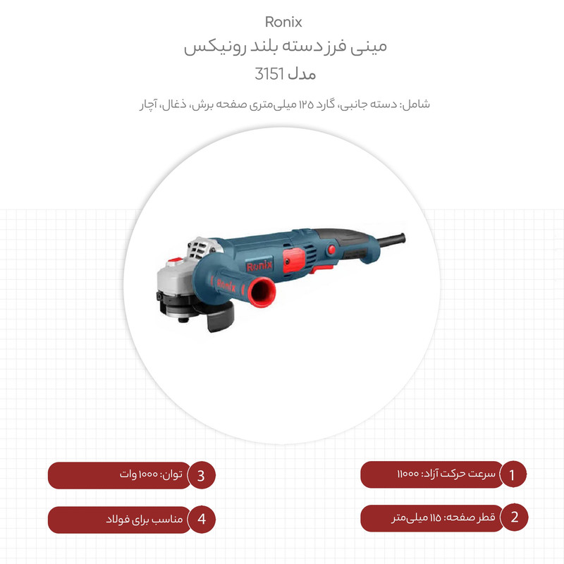 مینی فرز دسته بلند رونیکس مدل 3151 بدنه‌ای متفاوتی نسبت به سایر مینی‌فرزهای موجود در بازار دارد. مدل 3151 یک مینی‌فرز 1000 واتی است.صفحه‌ی فرز این دستگاه در حالت آزاد با سرعت 11000 دوربردقیقه می‌چرخد. برای استفاده از این محصول مانند بسیاری از مینی‌فرزها باید از صفحه‌ی فرز با قطر 115 میلی‌متر استفاده کنید. این مدل مجهز به سیستمی است که باعث می‌شود گریس به‌صورت مداوم در میان چرخ‌دنده‌ها وجود داشته باشد؛ این موضوع کارایی و عمر دستگاه را افزایش می‌دهد. بدنه‌ی مدل 3151 نسبت به بیشتر مینی‌فرزها متفاوت است. شکل بدنه‌ی این محصول طول بلندی دارد و به کاربر در استفاده‌ی راحت‌تر از دستگاه کمک می‌کند. دسته‌ی کمکی پلاستیکی این دستگاه را می‌توانید از سه جهت به دستگاه متصل کنید.