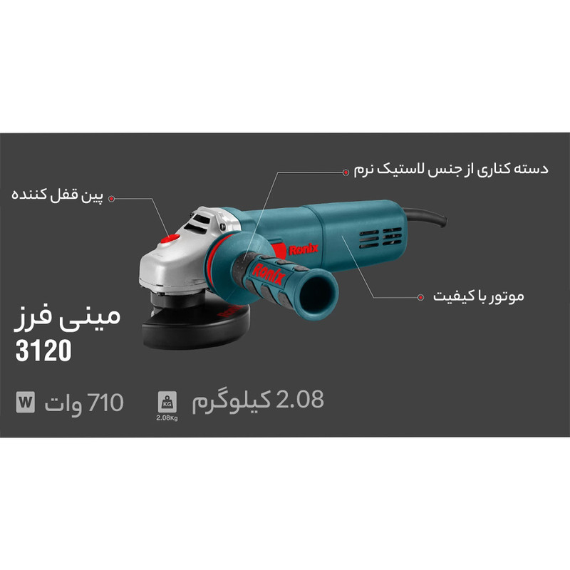 مدل 3120 یکی از مینیفرزهای تولیدشده توسط شرکت «رونیکس» (Ronix) به شمار میآید. این مینیفرز به موتوری قدرتمند و گیربکس دو تکه مجهز شده است. مدل 3120 یک مینیفرز با قدرت 710 وات است. صفحهی فرز این دستگاه در حالت آزاد با سرعت 11000 دوربردقیقه میچرخد. مانند بسیاری از مینیفرزهای موجود در بازار، برای استفاده از این مدل باید از صفحهی فرزهایی با قطر 115 میلیمتر استفاده کنید. رونیکس این محصول خود را با یک گیربکس دوتکه تولید میکند؛ این موضوع باعث اثربخشی و عملکرد بهتر دستگاه میشود. همچنین 3120 به سیستم خنککاری مجهز شده است که باعث گردش مداوم هوا در موتور، گیریکس و چرخدندهها خواهد شد؛ این قابلیت هم کارایی و عمر دستگاه را افزایش میدهد. دستهی کمکی پلاستیکی این دستگاه را میتوانید از سه جهت به دستگاه متصل کنید. شرکت رونیکس یکی از تولیدکنندگان داخلی ابزار است که محصولات بسیار متنوعی در این زمینه تولید کرده و برای حفظ جایگاه خود در بازار با شرکتهایی نظیر نووا و توسن رقابتی تنگاتنگ دارد. اگر بخواهیم برش و سنباده زدن فلزات را به کمک دستگاههای برقی انجام دهیم، دستگاه فرز یکی از گزینههای موجود است. این دستگاه کاربرد بسیار زیادی در خصوص برش یا سنباده زدن فلزات دارد. این ابزار در گونههای مختلفی تولید و به بازار عرضهشده است که مینیفرز یکی ازاینگونهها است. از مینیفرز در جاهایی که با محدودیت فضا مواجه هستیم استفاده میشود. علاوه بر این حجم کم این نوع فرز باعث میشود تا کاربر راحتتر از دستگاههای فرز معمولی یا بزرگ، از مینیفرز استفاده کند.