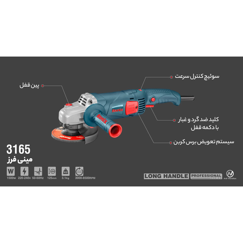 | سایر توضیحات | مجهز به موتور پرقدرت 1500 واتی با مقاومت بالا برای عملکردهای برش و سنگبری باکیفیت در فعالیتهای سنگین – دارای دسته جانبی ضد لرزش جهت به حداقل رساندن خستگی کاربر هنگام فعالیت و افزایش دقت عملکرد محصول – مجهز به سیستم گردش هوای داخلی پیشرفته – قابلیت تنظیم سرعت فرز از 3000 تا 8500 دور در دقیقه برای کنترل سرعت و بهره وری بیشتر بر سطوح مختلف – قابلیت تعویض سریع و آسان صفحه برش – طراحی منحصربفرد در قسمت جاذغالی جهت تعویض سریع و آسان ذغالها – مجهز به سیستم قفلکن شفت پیشرفته جهت نصب آسان و ایمن صفحه برش – دارای کلید ضد گرد و غبار جهت کاهش نفوذ گرد و غبار به داخل فرز به ویژه در مصارف ساختمانی |