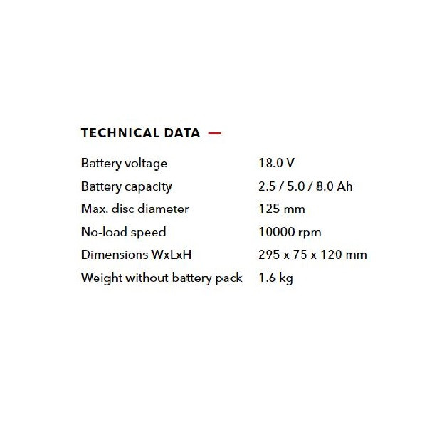 • اقلام همراه: دو عدد باتری 18V-5Ah و یک عدد شارژر صنعتی مدل CA 18.0- یک عدد گارد-یک عدد دسته ضد ارتعاش یک عدد آچار مخصوص- یک عدد مهره M 14 – یک عدد مهره فلنج- کیف حمل